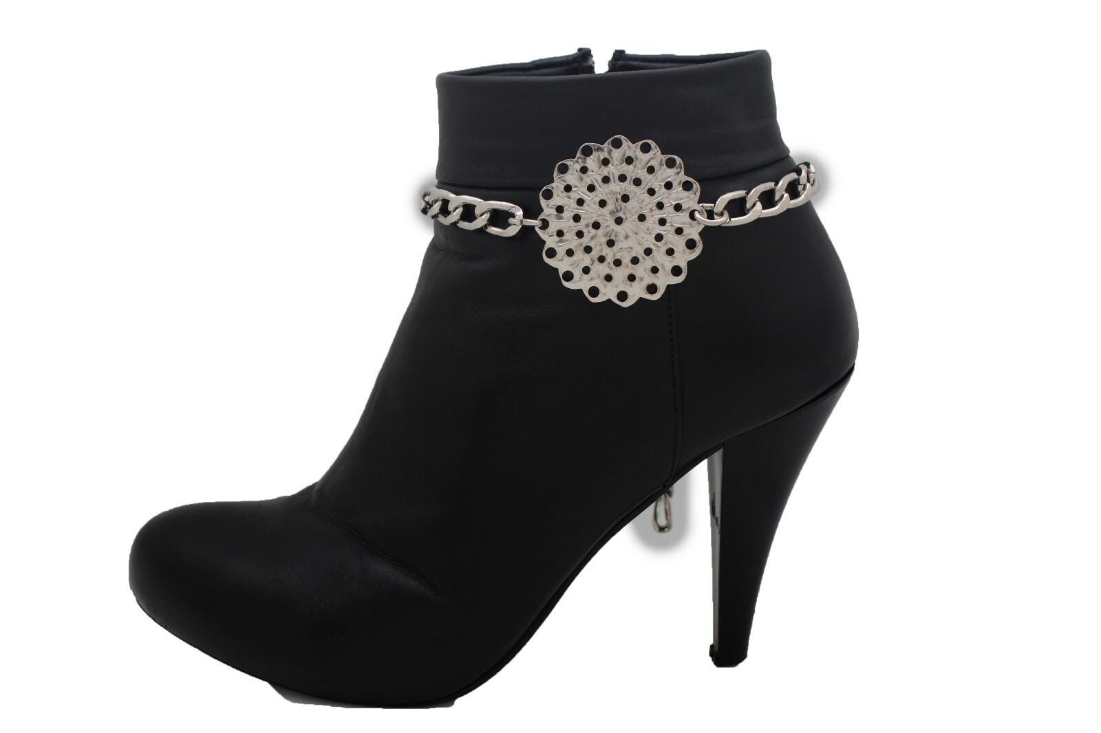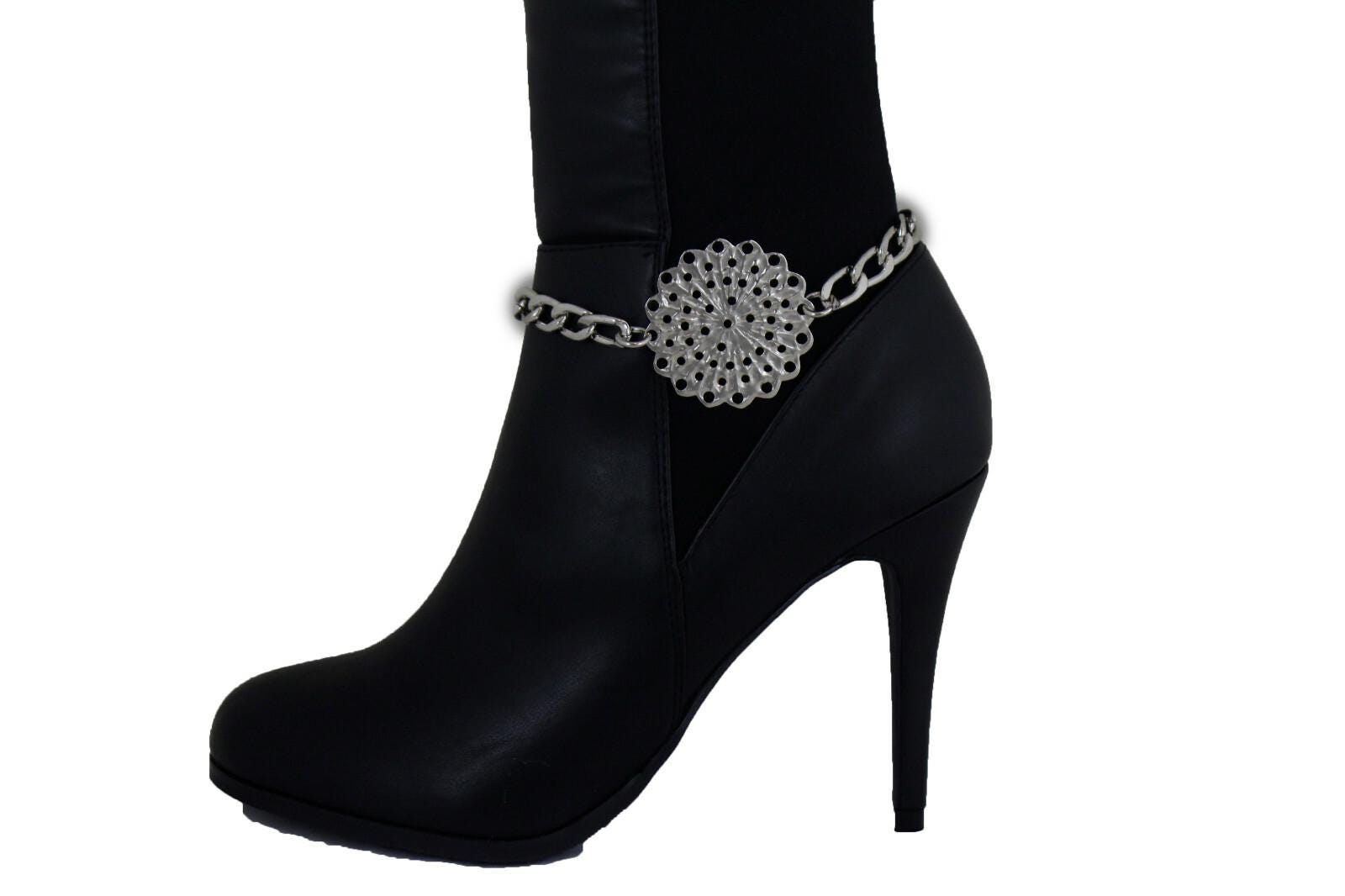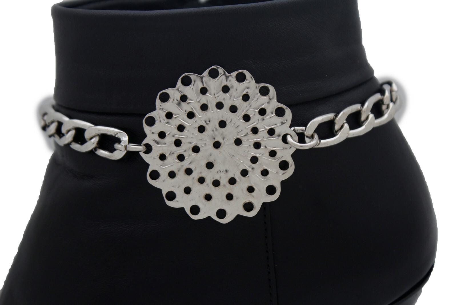 This listing is for bc215, a matching pair of silver tone boot chains designed to wrap the ankle area and feature a bold flower medallion with a pretty perforated pattern. It’s the kind of detail that makes a simple outfit look styled in seconds—no extra effort, no complicated layering, just clip-on confidence.