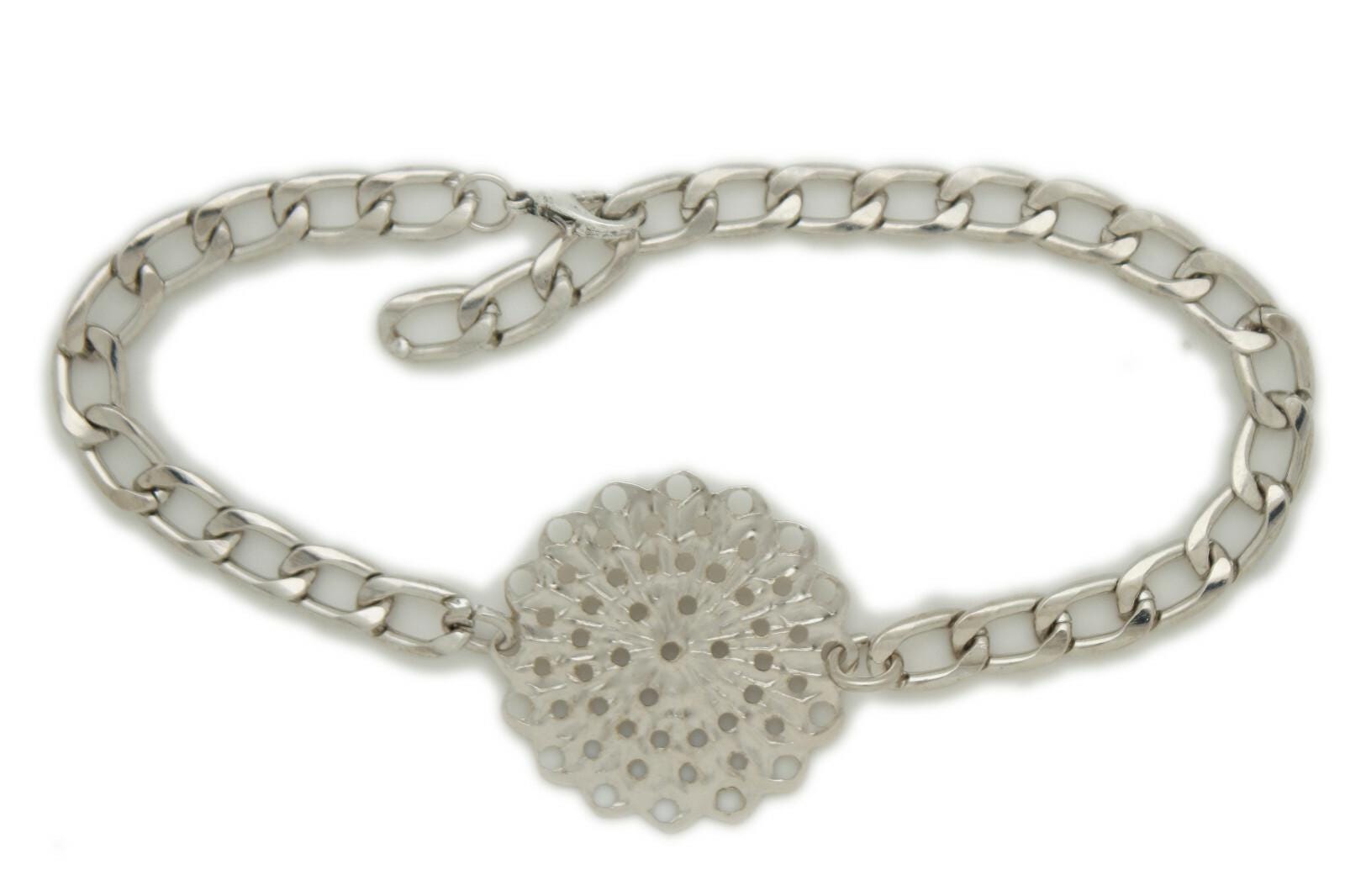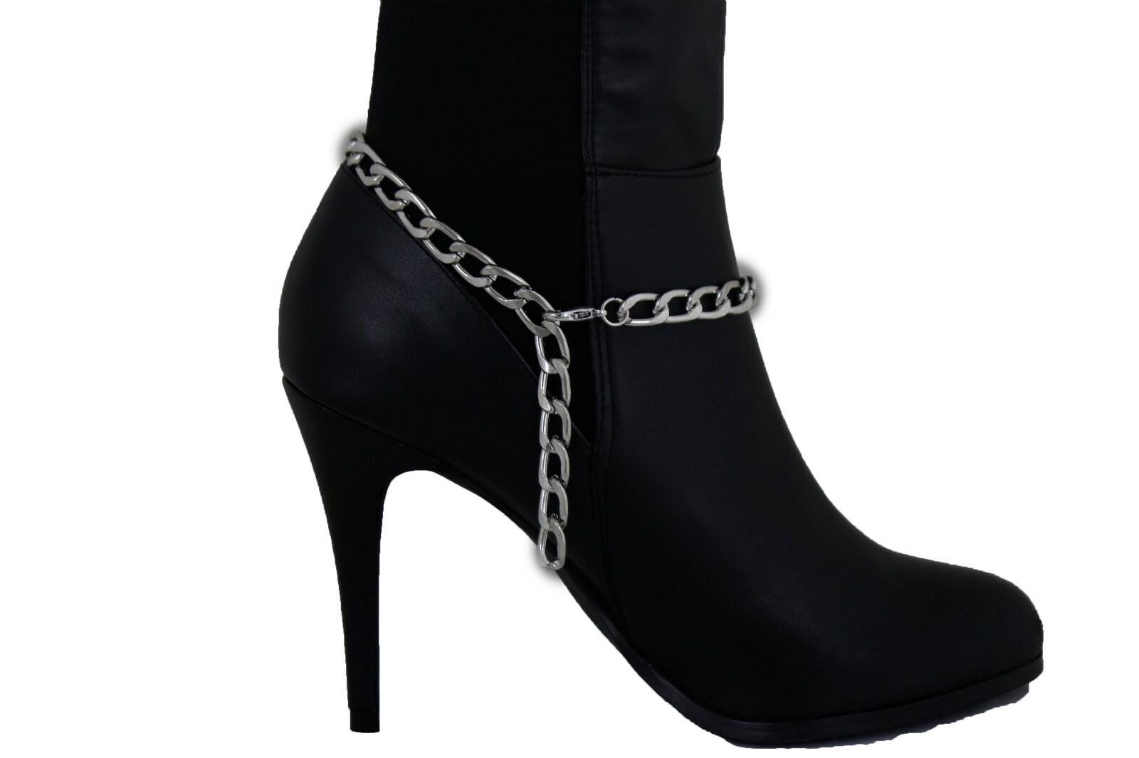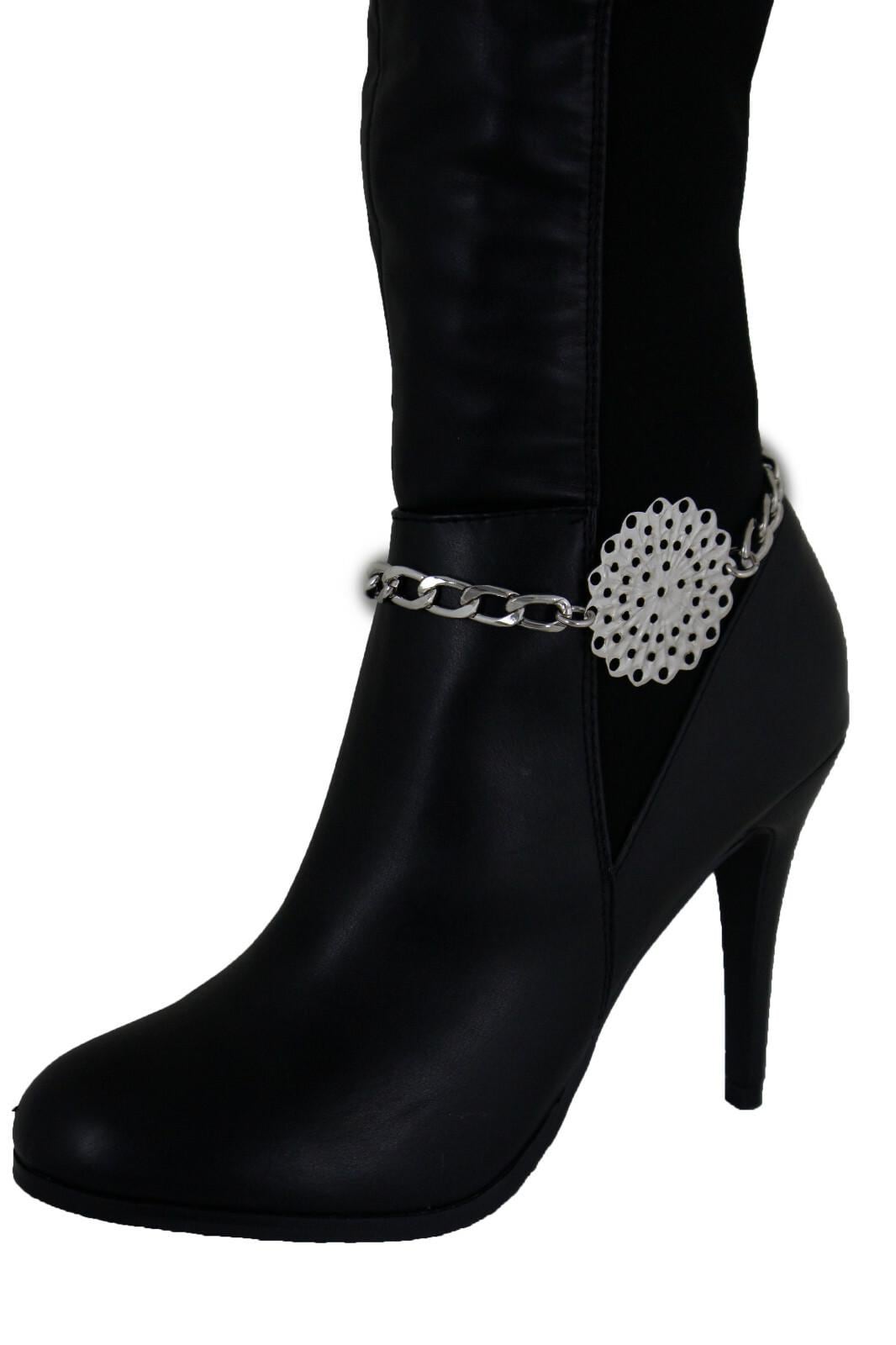 This listing is for bc215, a matching pair of silver tone boot chains designed to wrap the ankle area and feature a bold flower medallion with a pretty perforated pattern. It’s the kind of detail that makes a simple outfit look styled in seconds—no extra effort, no complicated layering, just clip-on confidence.