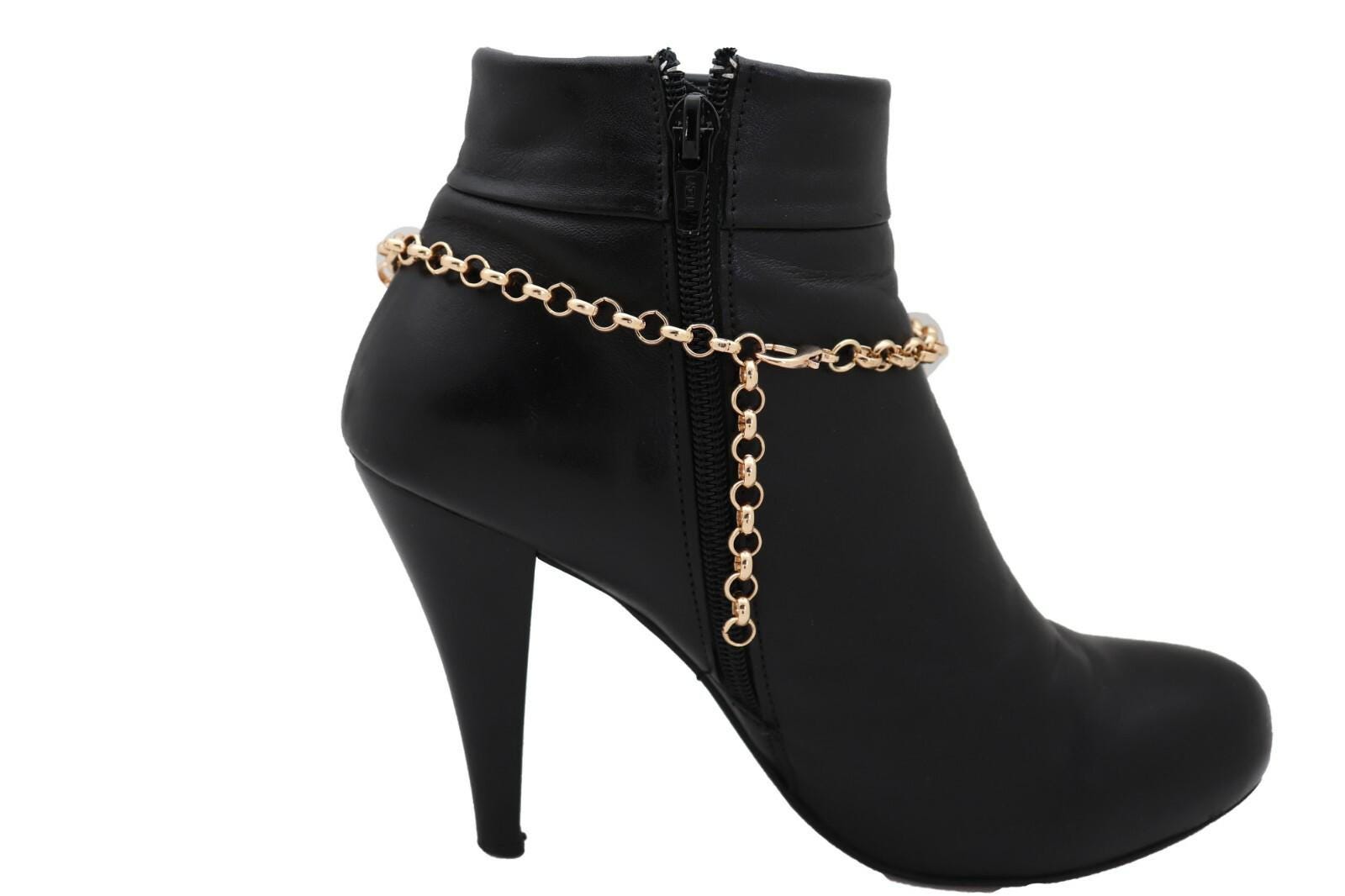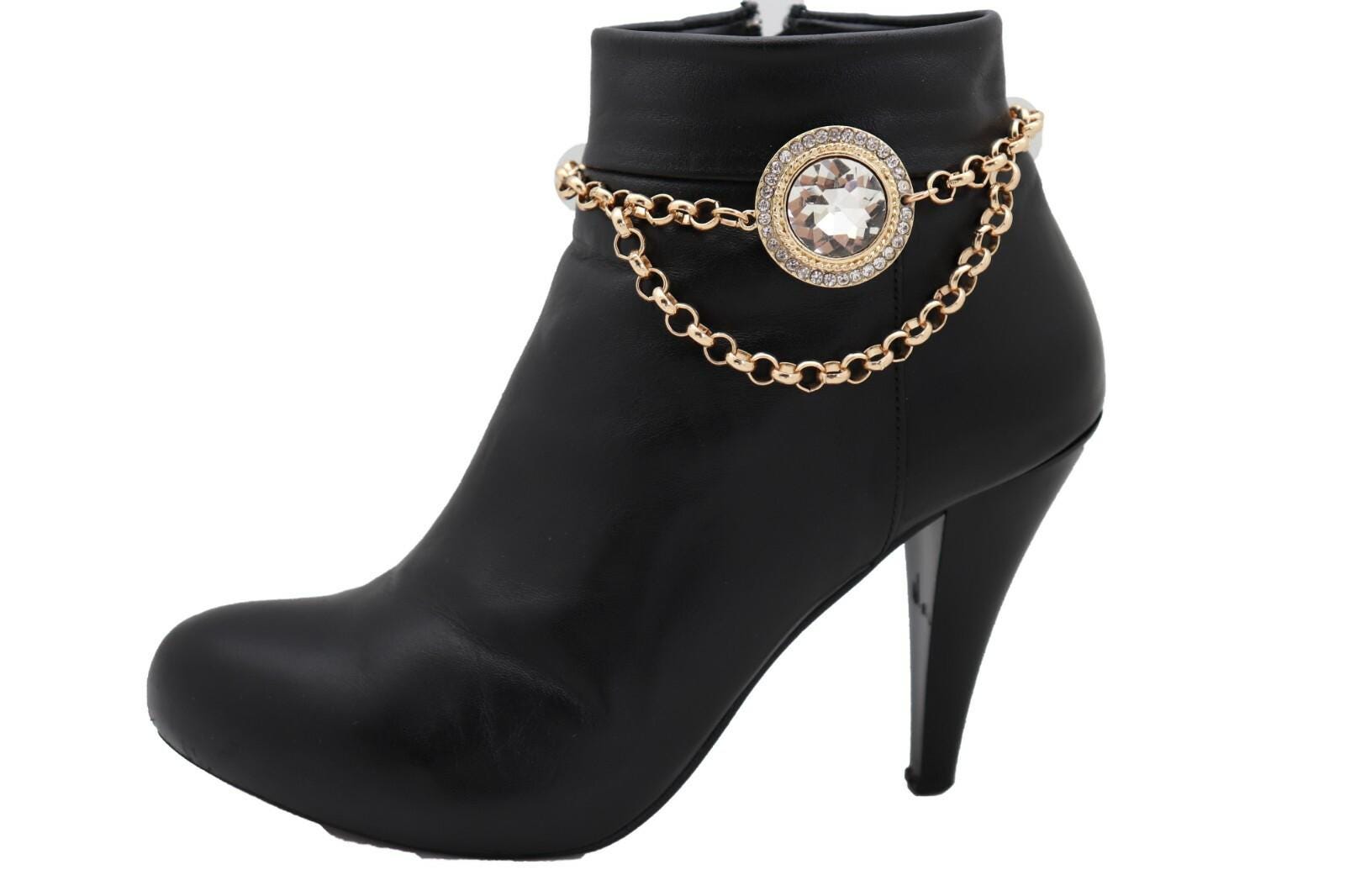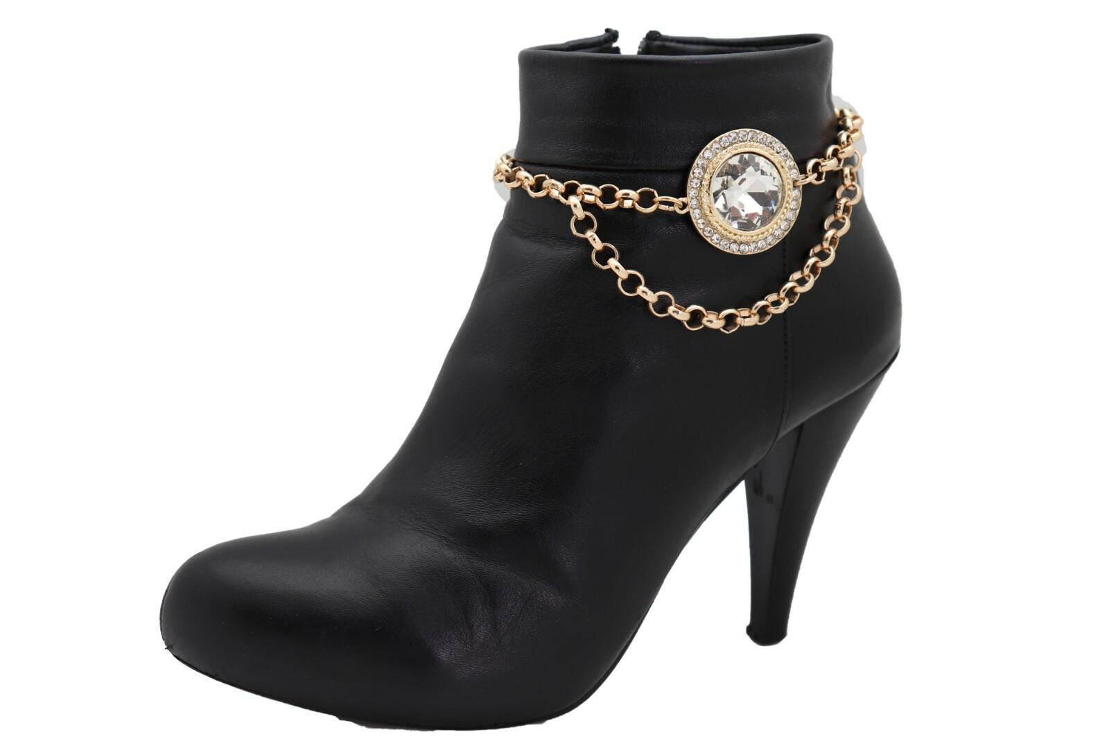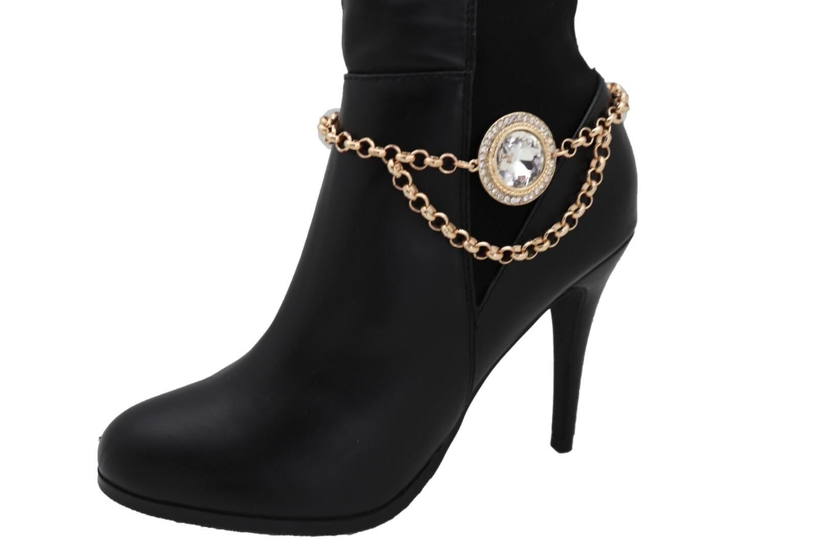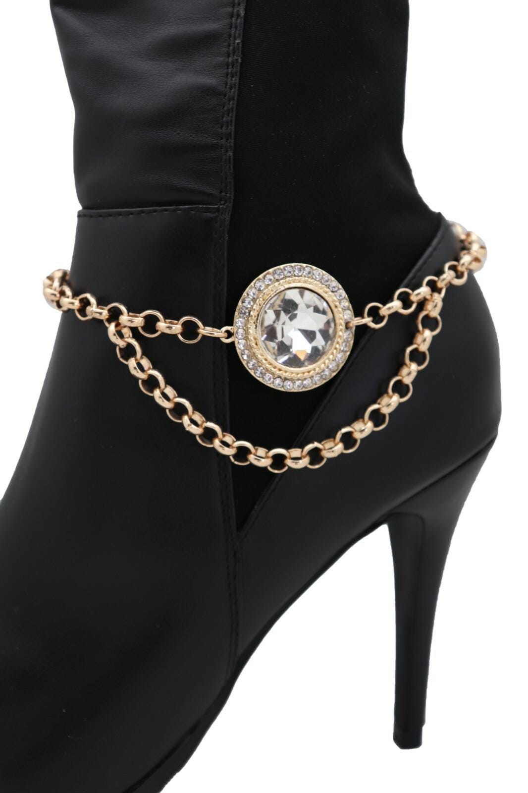 Meet your newest “instant outfit finisher.” This gold tone boot chain bracelet pair is designed to wrap your boot shaft/ankle area with a clear crystal halo medallion that catches light beautifully, plus a draped chain detail that adds movement and that styled-on-purpose look.