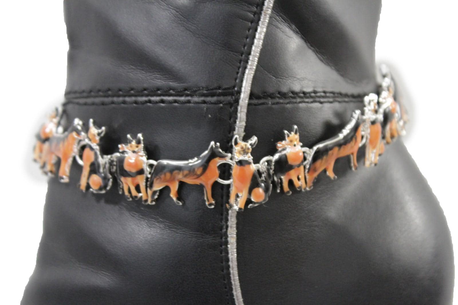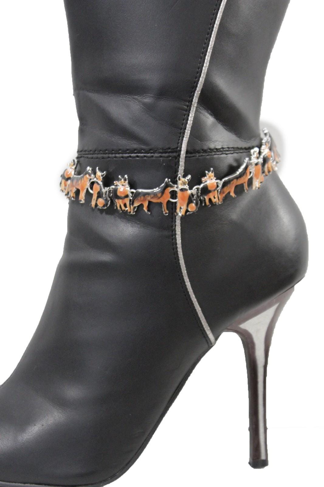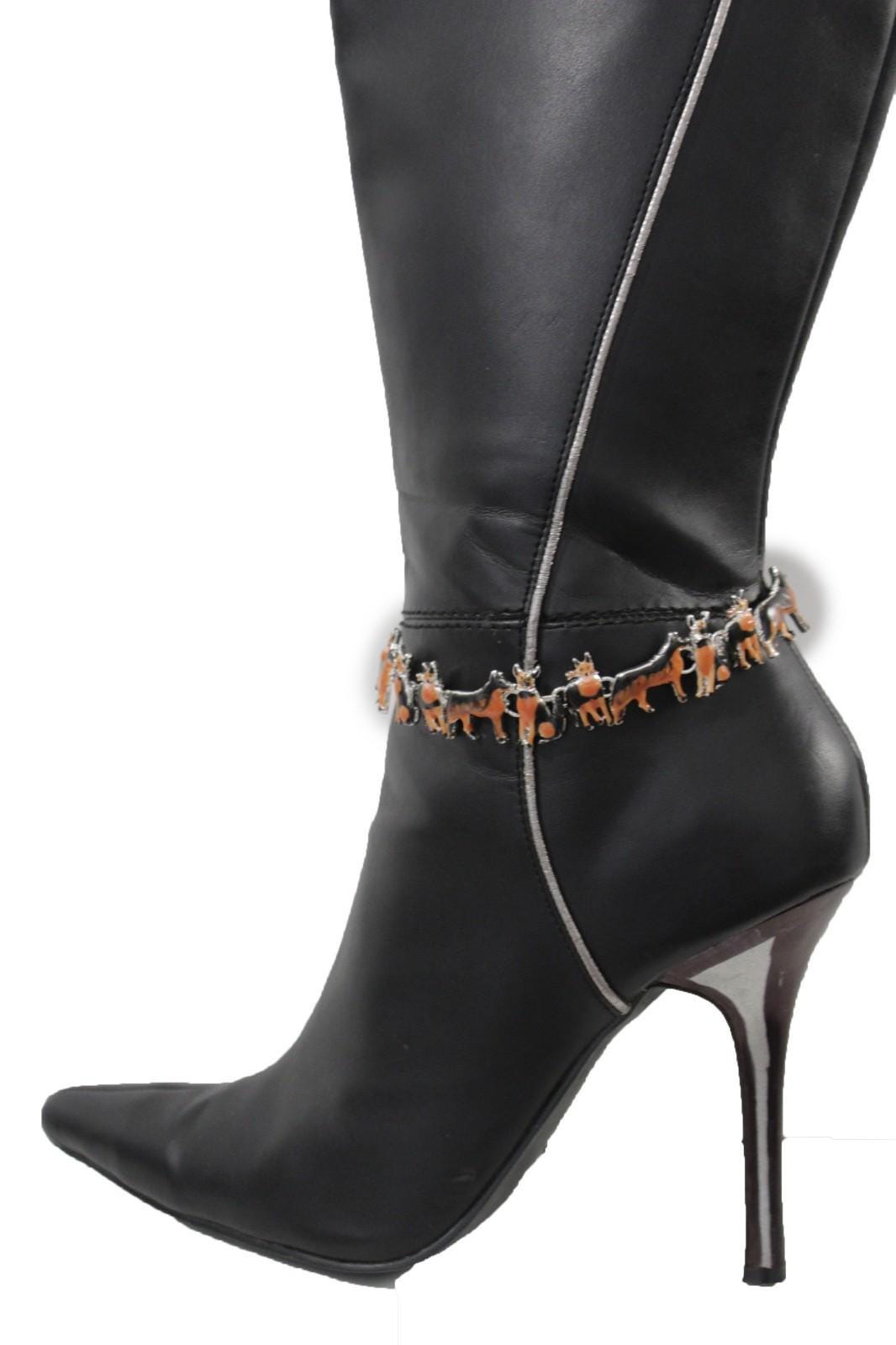 your boots deserve a little personality—and this pair delivers it in the cutest way. these dog charm boot chain bracelets wrap around the ankle area of your boots like jewelry for footwear, featuring silver tone chain links and black/brown enamel dog charms that instantly make your outfit feel styled, fun, and photo-ready.