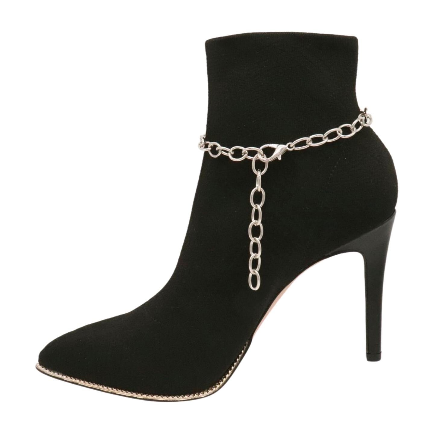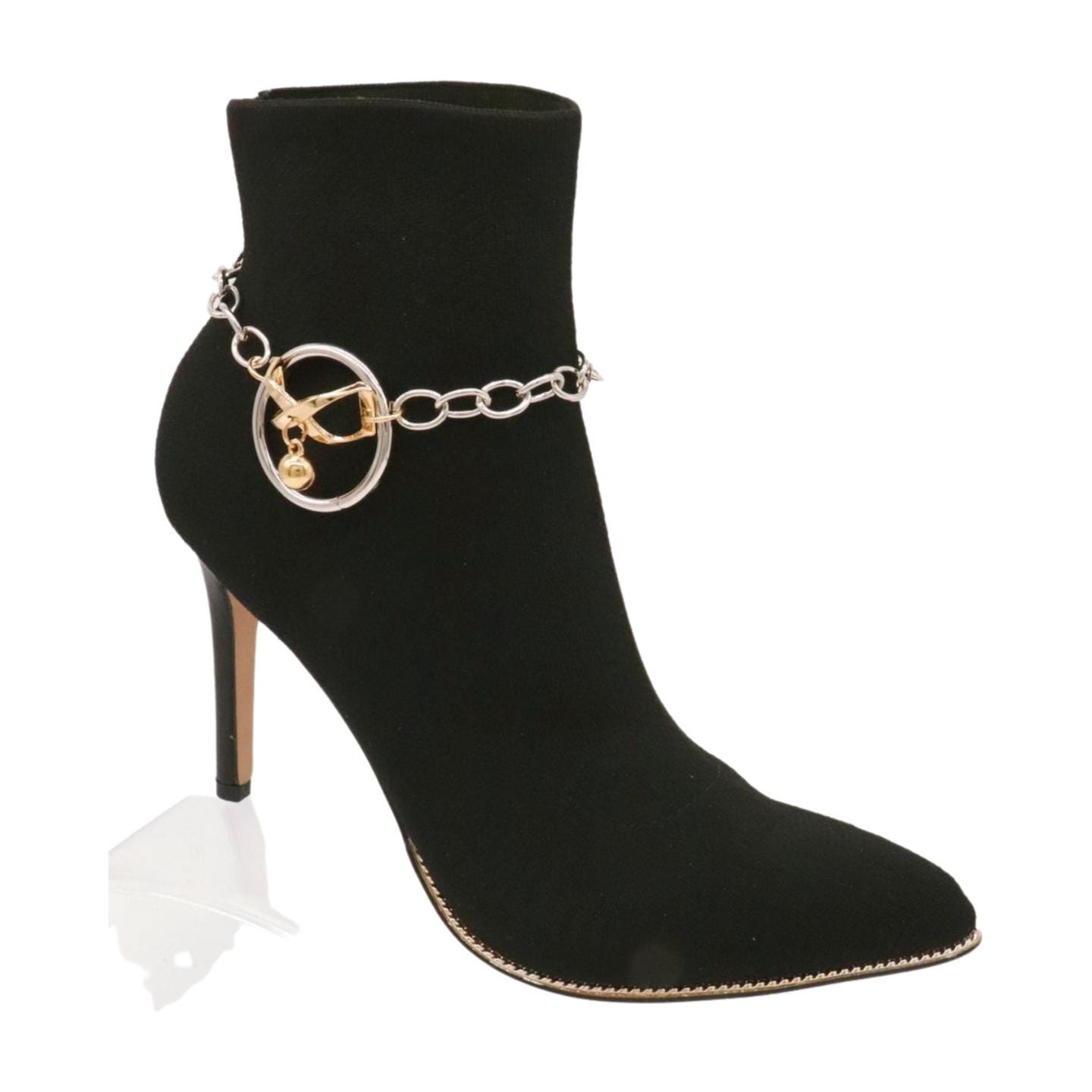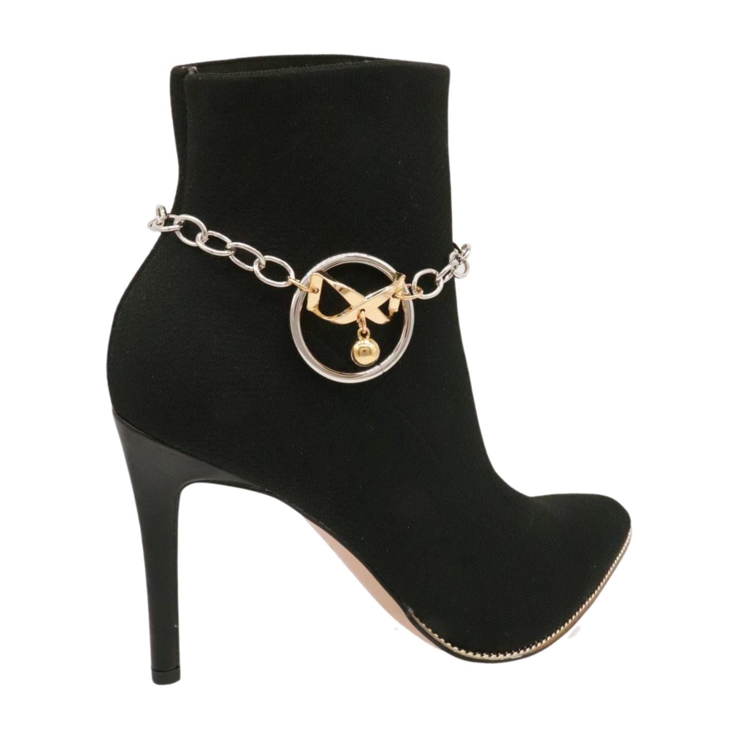 Meet your new favorite “instant outfit upgrade.” This two-tone boot chain bracelet set is sold as a pair (2pcs) so you can style one on each boot for a balanced, photo-ready look. The design features a silver-color chain with a standout gold infinity bow charm, a tiny hanging ball, and a polished circle centerpiece that catches the light when you walk.