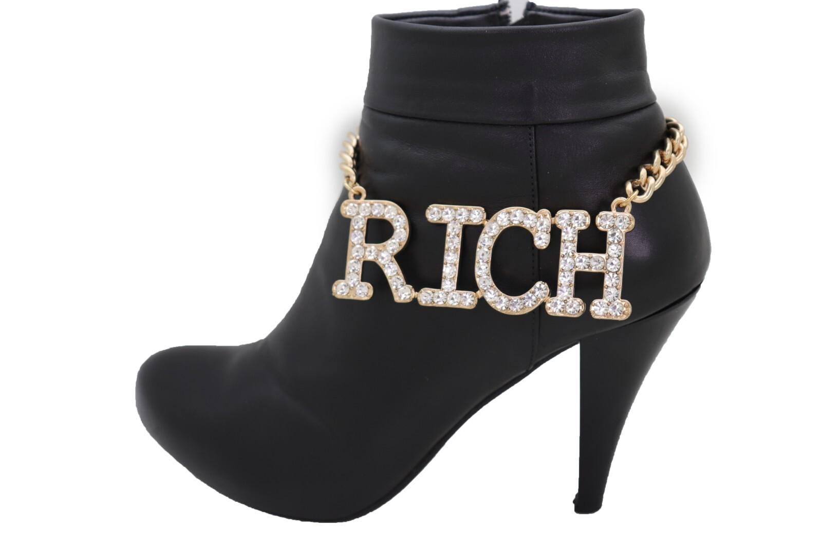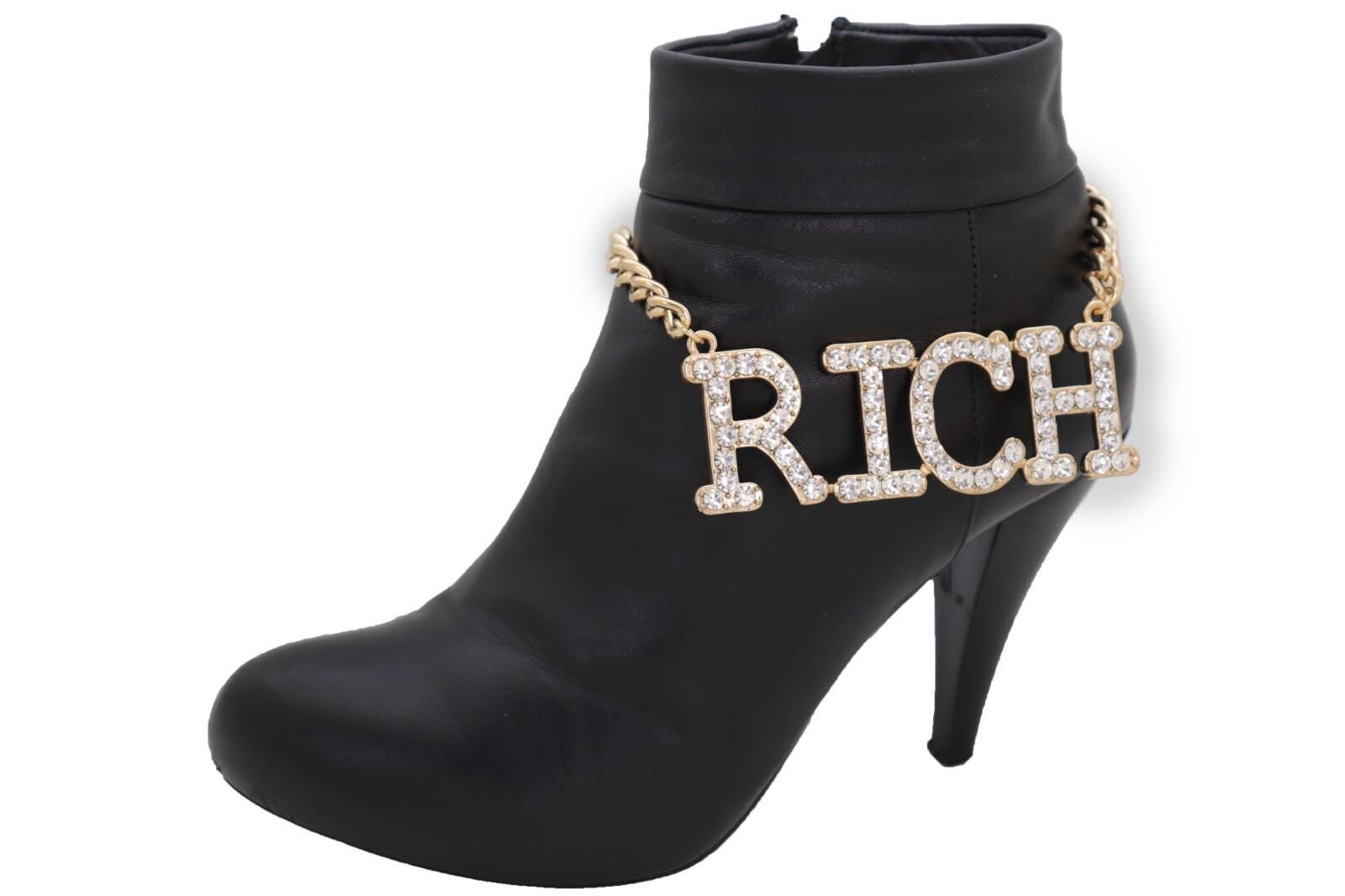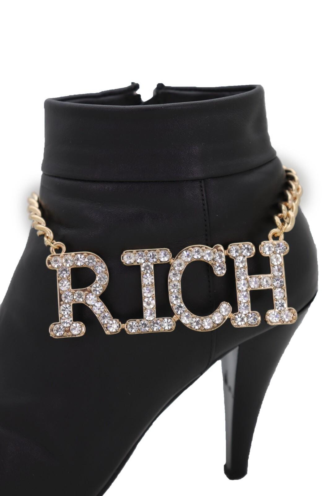 This listing is for a pair (2pcs) of our handmade boot chain bracelets featuring a bold rhinestone “Rich” letter charm on a gold-tone chain. The vibe is equal parts western glam and street-style sparkle, and it looks amazing on ankle boots, cowboy boots, tall boots, and heeled boots.