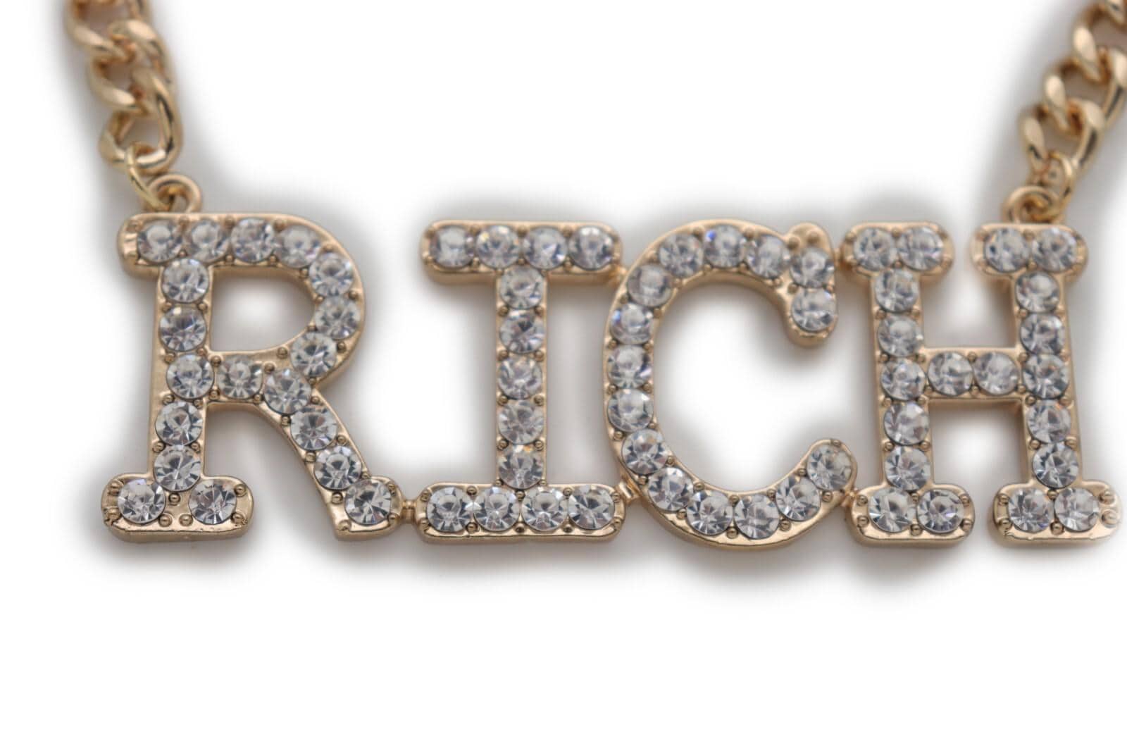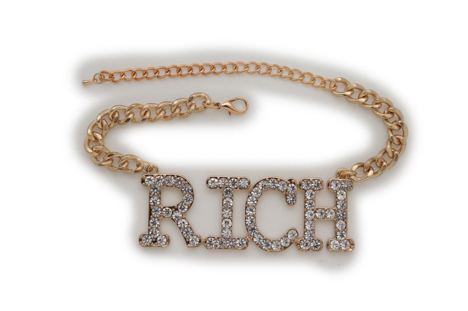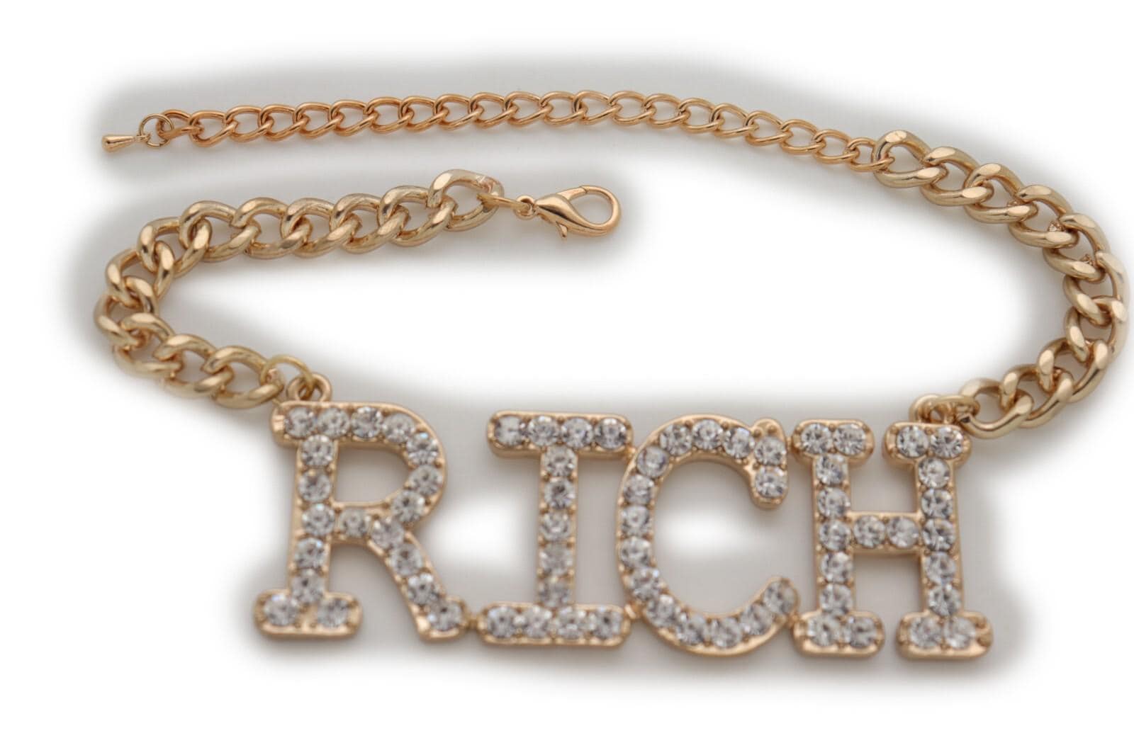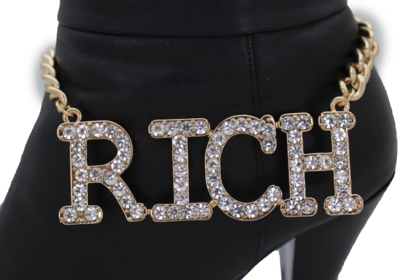 This listing is for a pair (2pcs) of our handmade boot chain bracelets featuring a bold rhinestone “Rich” letter charm on a gold-tone chain. The vibe is equal parts western glam and street-style sparkle, and it looks amazing on ankle boots, cowboy boots, tall boots, and heeled boots.