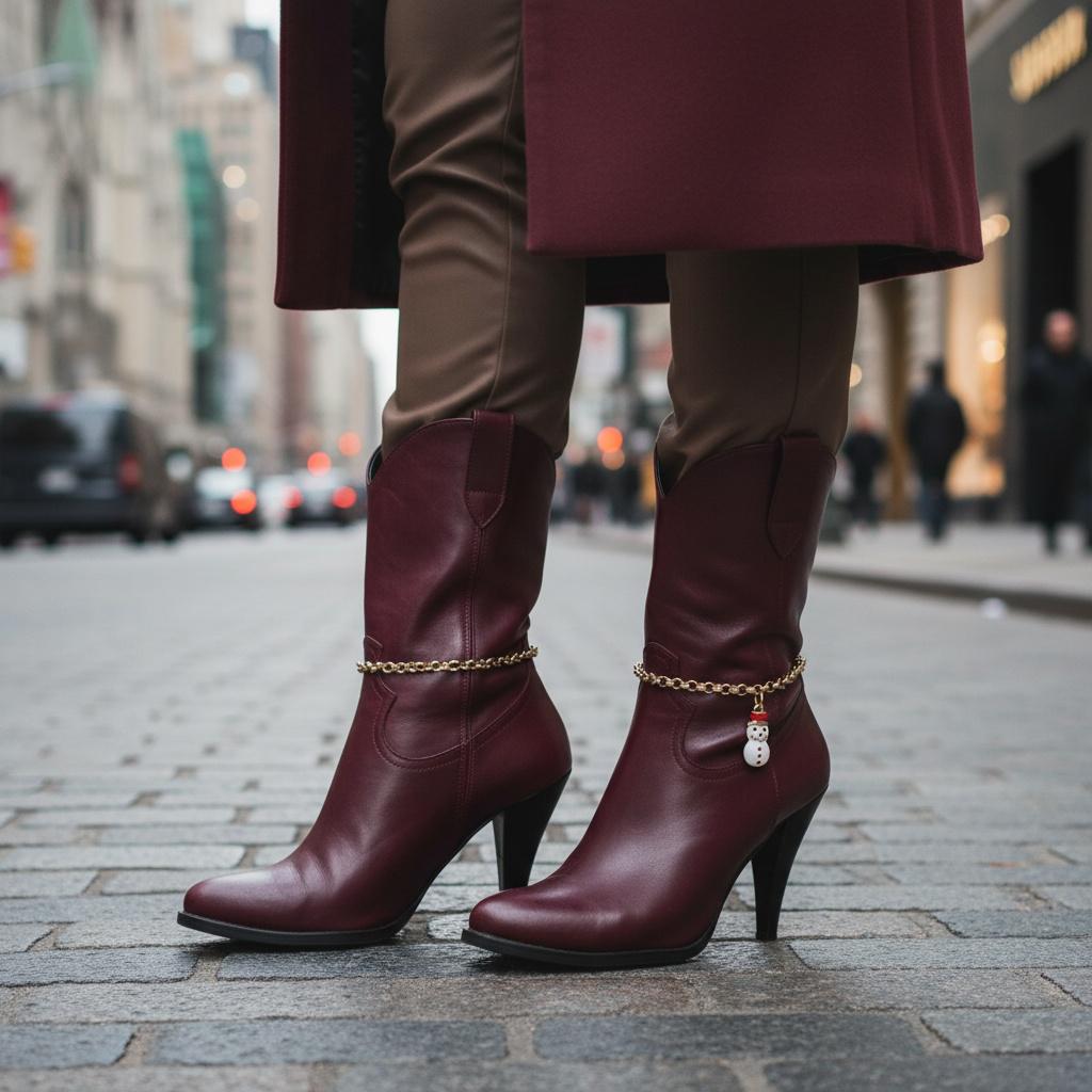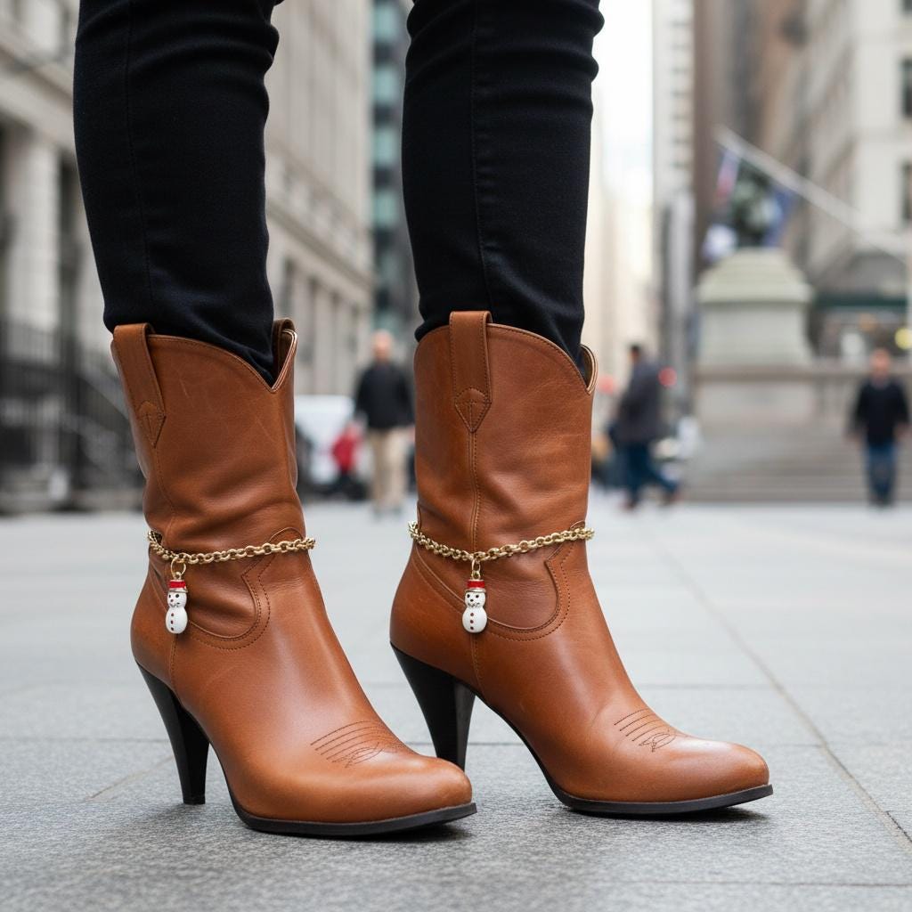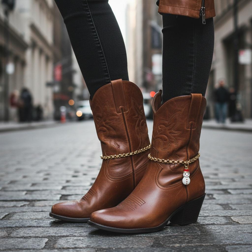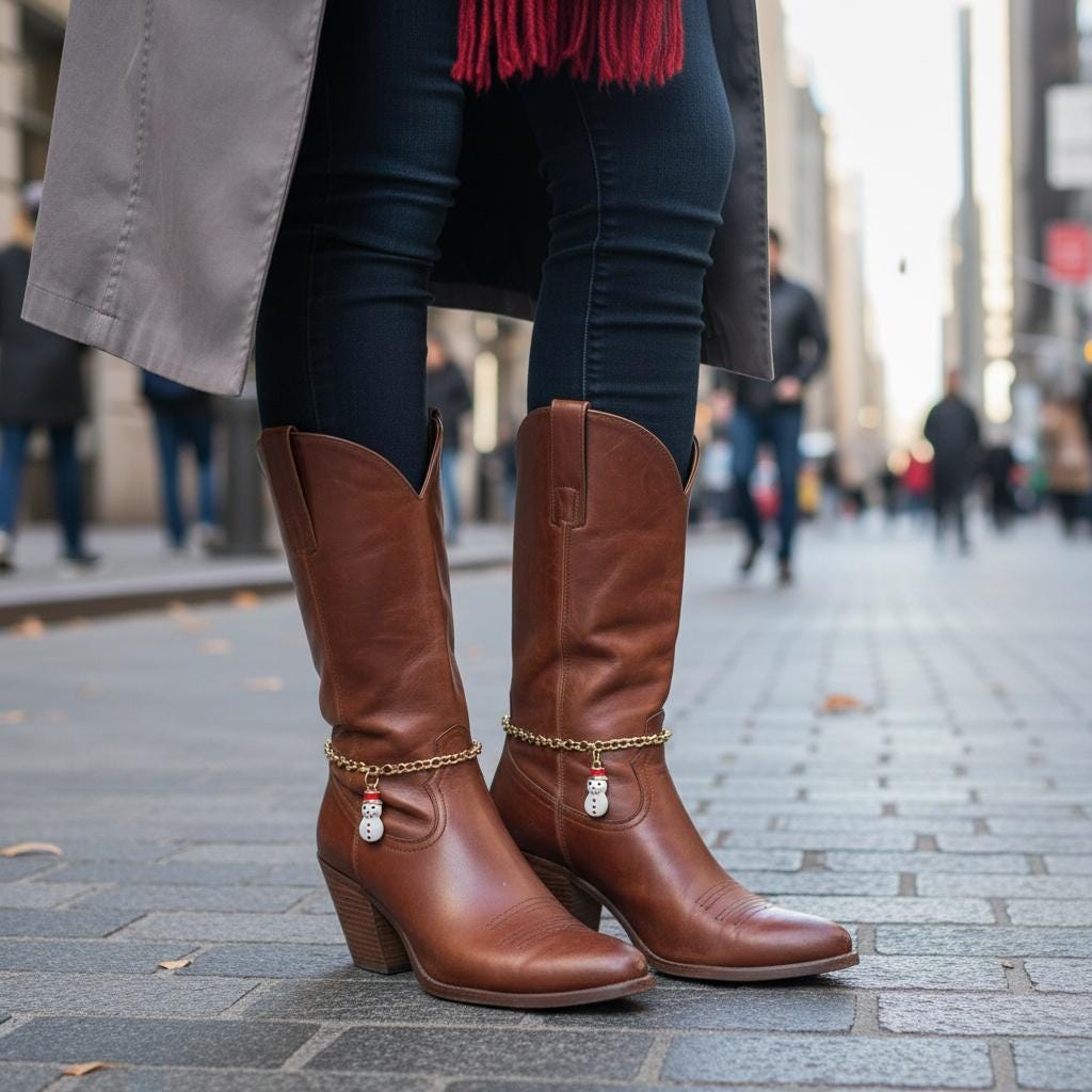 This design is a fun choice for anyone who loves holiday fashion, winter accessories, boot jewelry, country-inspired outfits, or giftable seasonal pieces with personality.