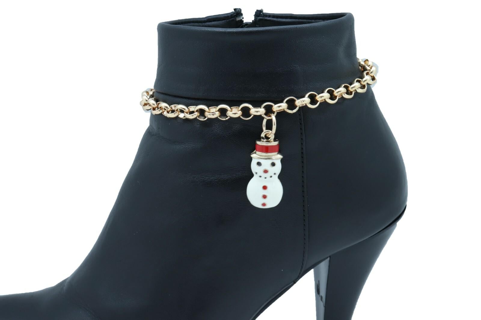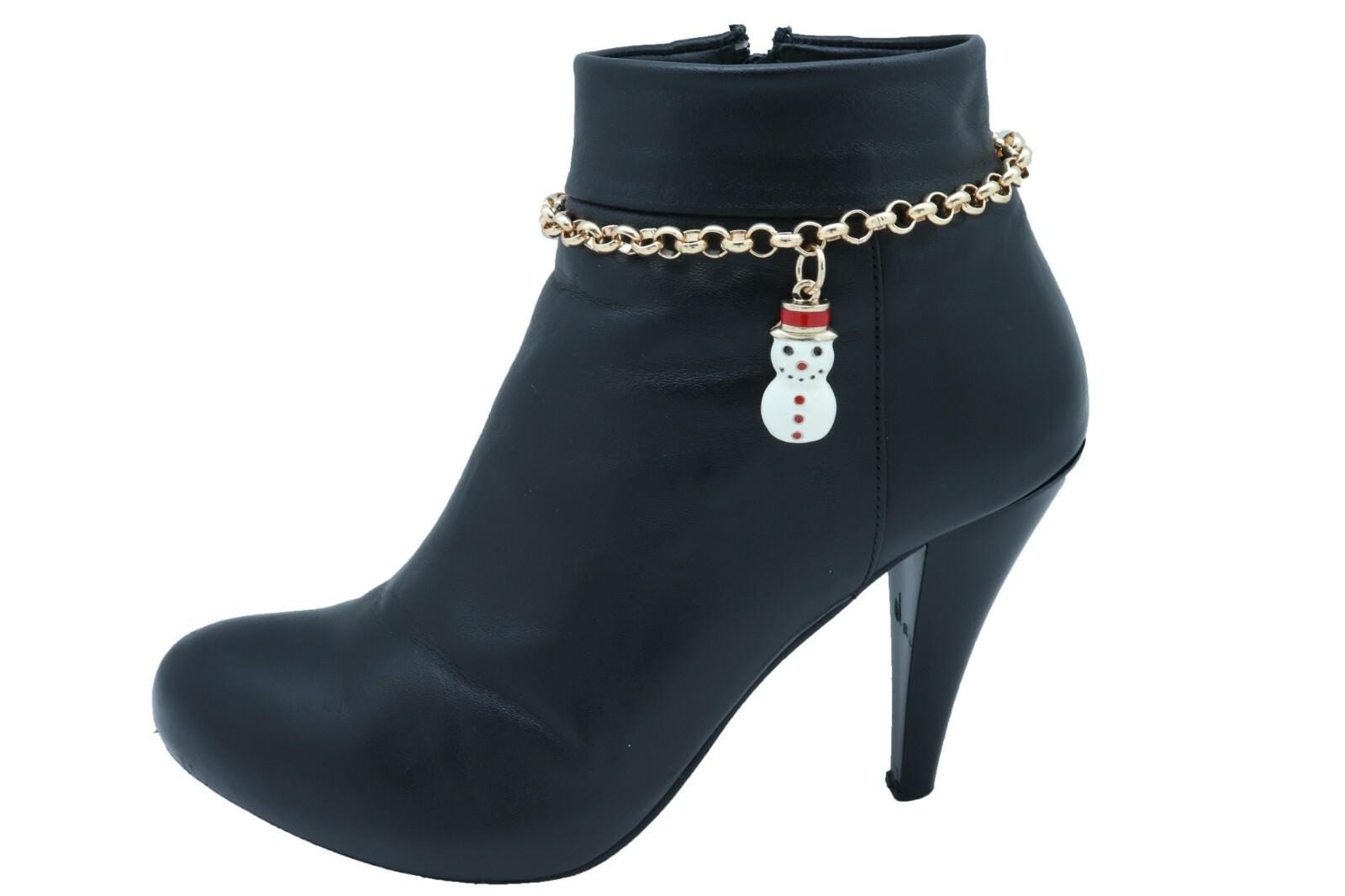 Add a festive little sparkle to your favorite boots with this handmade pair of women’s gold tone boot chain bracelets featuring a sweet white snowman charm. This holiday boot jewelry set is designed to wrap stylishly around your boots and give your winter outfit a fun, seasonal finish without changing the boots themselves.