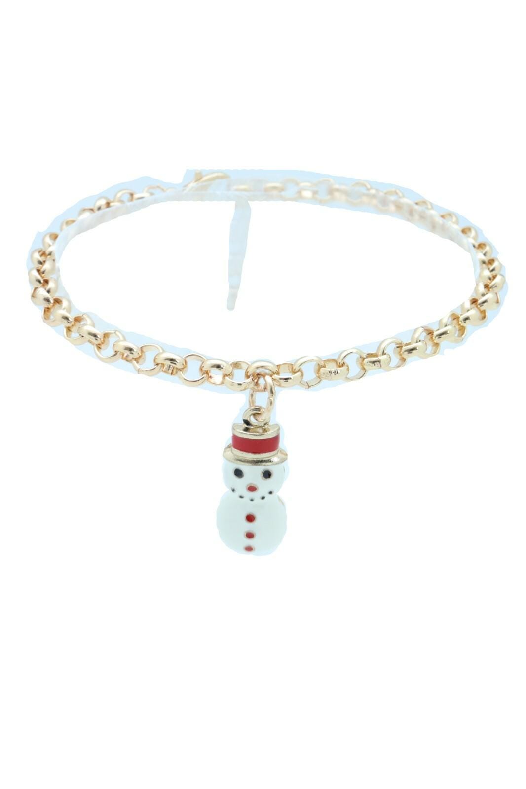 Color: Gold tone metal chain and charm with red, black, and white painted snowman detail