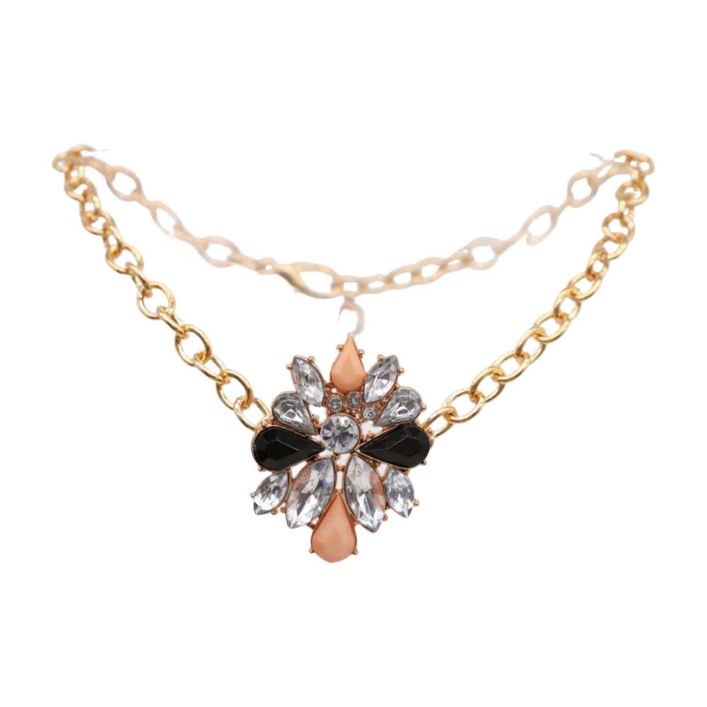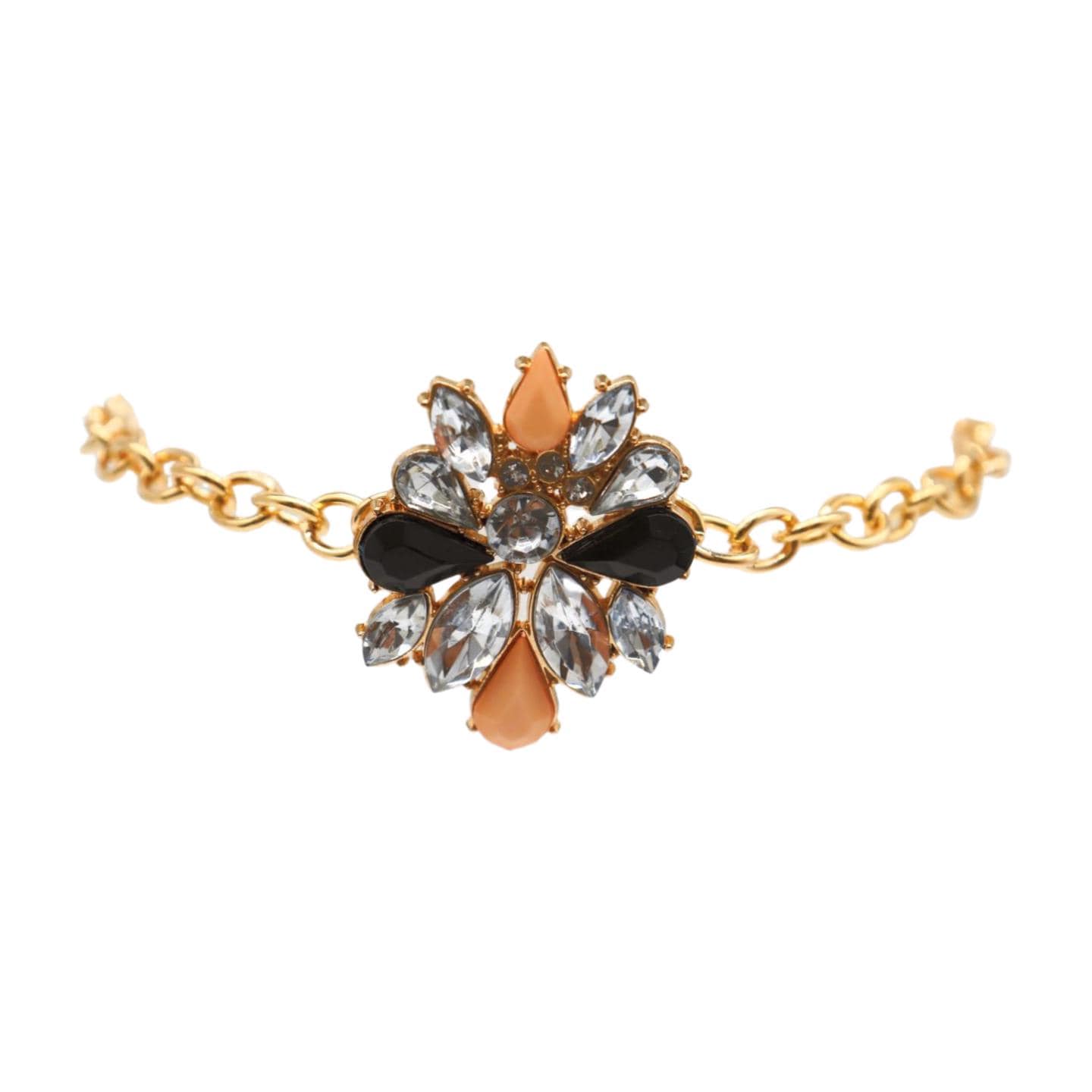 Color: gold color metal chain links and charm with black, coral, and silver-tone/clear detail