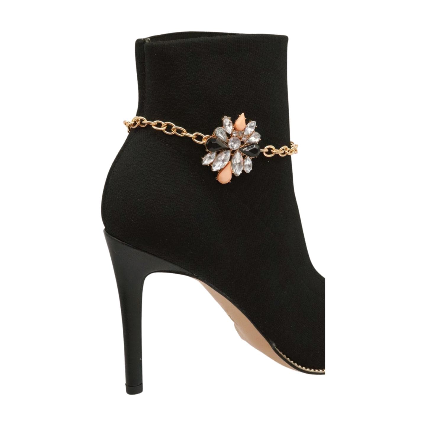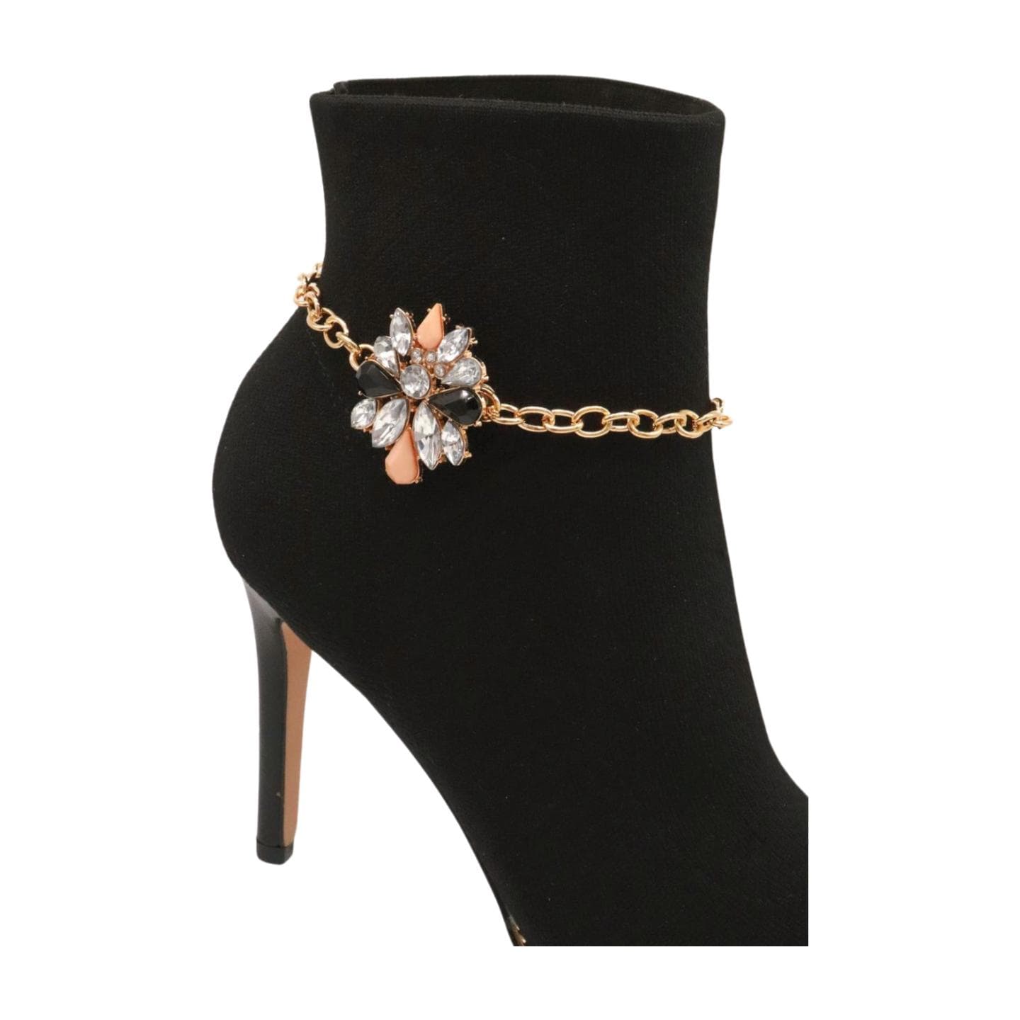The gold-tone chain gives the design a warm decorative look, while the center charm adds black, coral, and silver-tone/clear detail that helps the accessory stand out clearly on black, tan, brown, burgundy, and other neutral boots. This pair is designed to make simple boots look more styled without changing the boots themselves.
