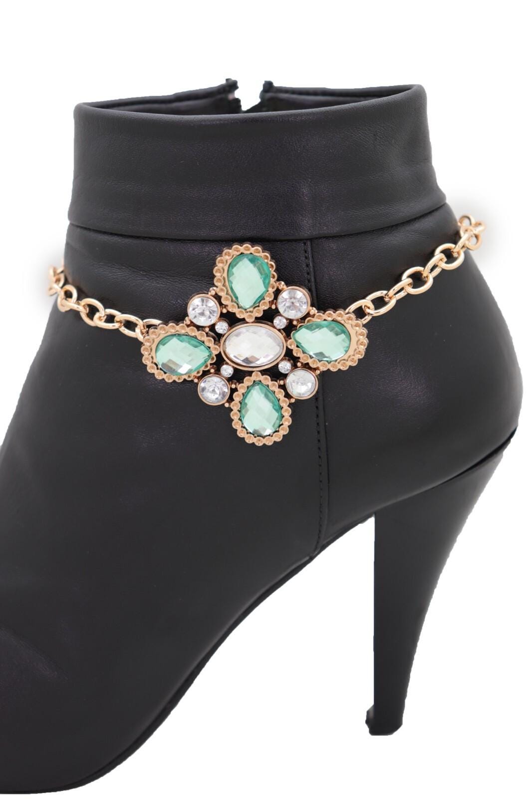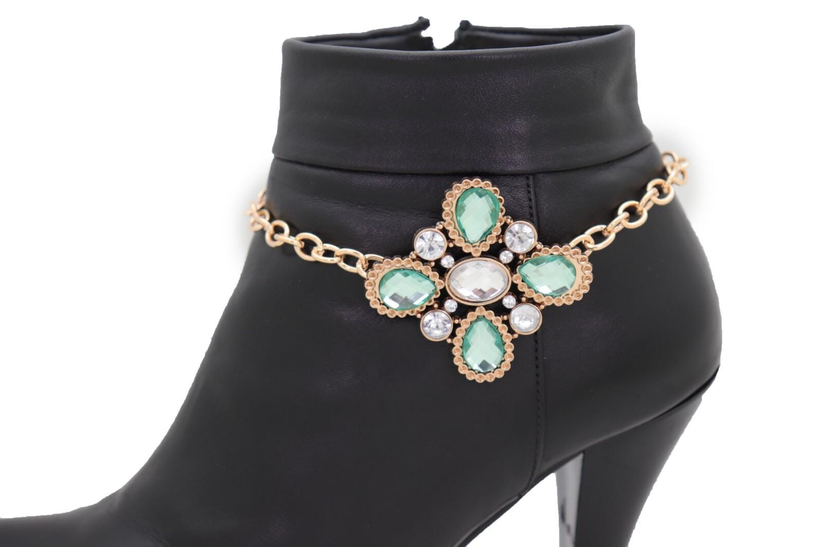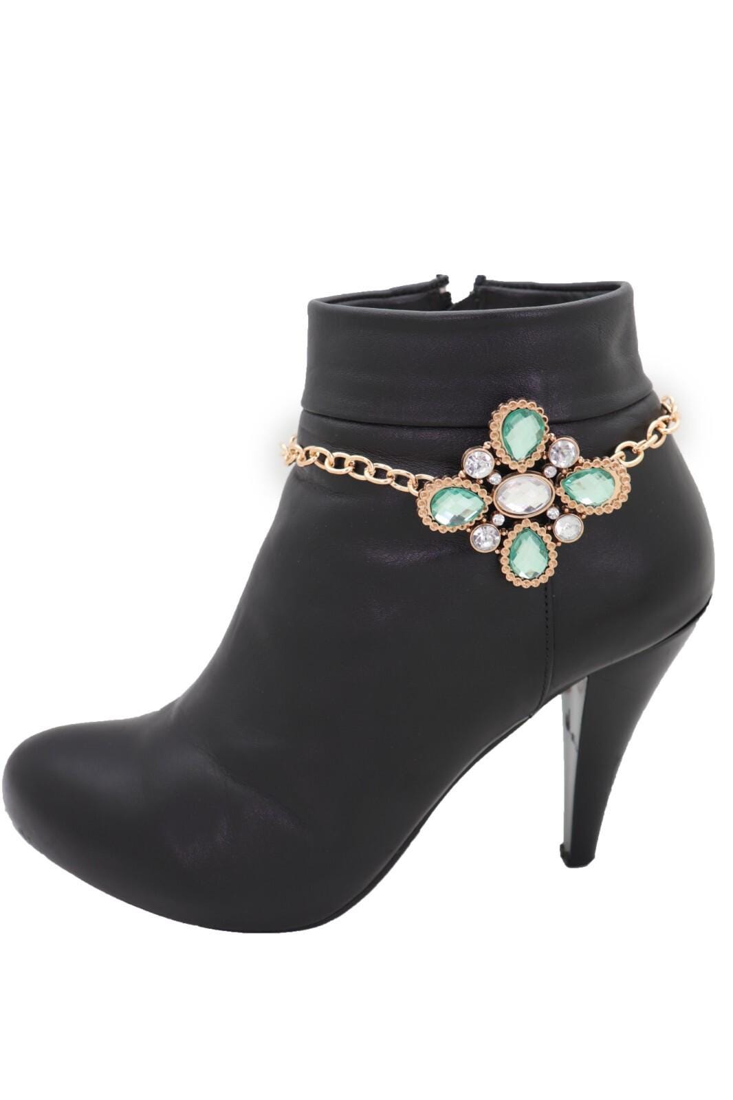 Add a bright polished finish to your favorite boots with this handmade pair of women’s gold tone boot chain bracelets featuring a decorative green flower centerpiece with clear rhinestone accents.