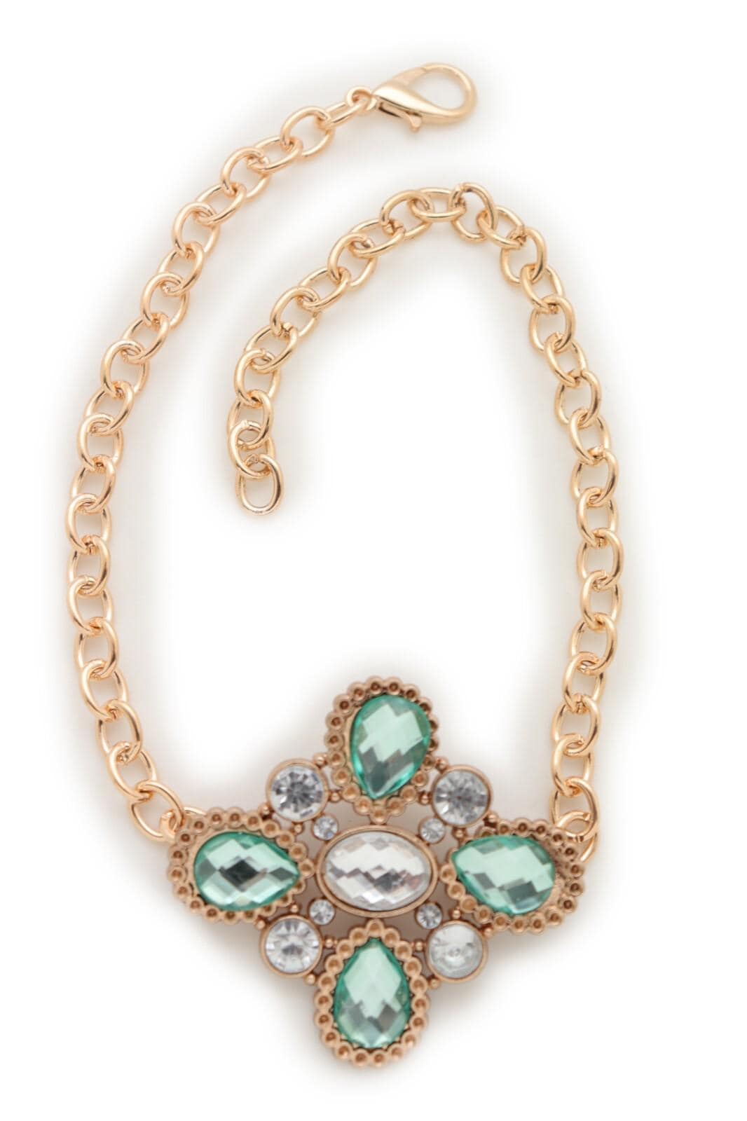gold color metal chain links, green rhinestone accents, clear rhinestone accents