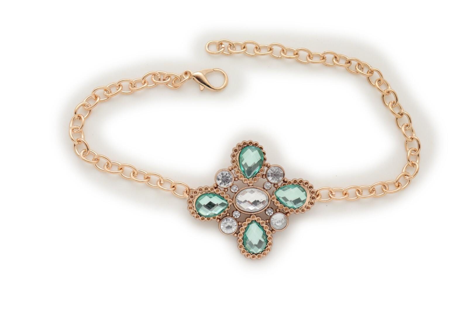 Color: gold tone with green and clear flower charm detail