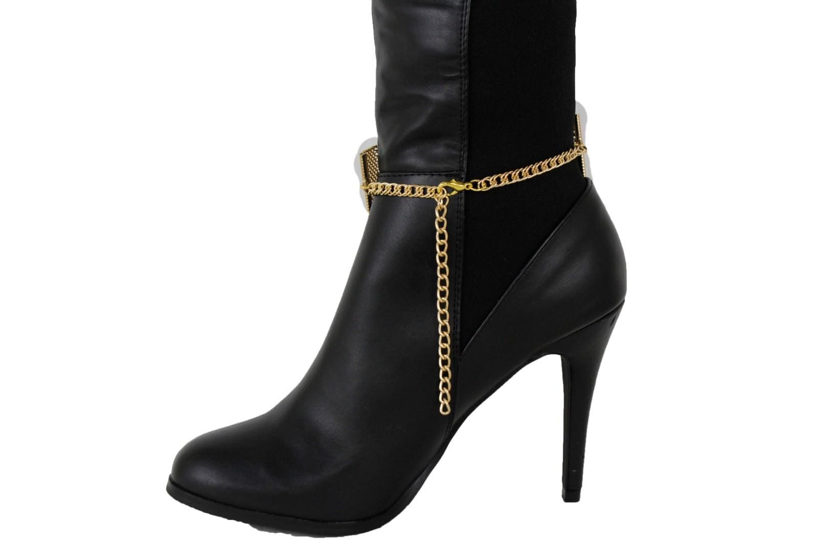 This handmade boot chain pair features gold color chain links, a textured mesh-style band, and a modern circular center accent that gives the design a polished boutique finish. It is sleek, stylish, and a little more refined than a basic chain-only boot accessory, which makes it especially beautiful on black boots, cream boots, brown boots, and fashion-color boots.