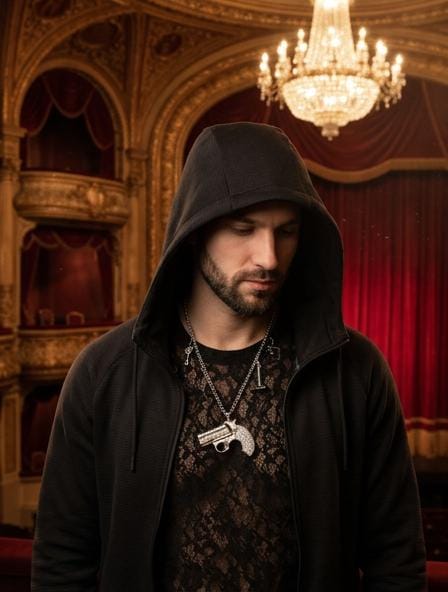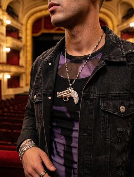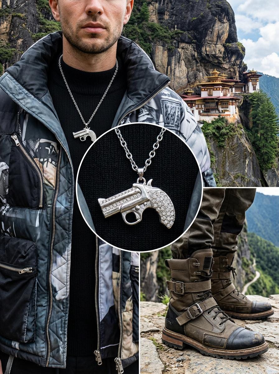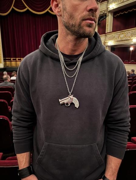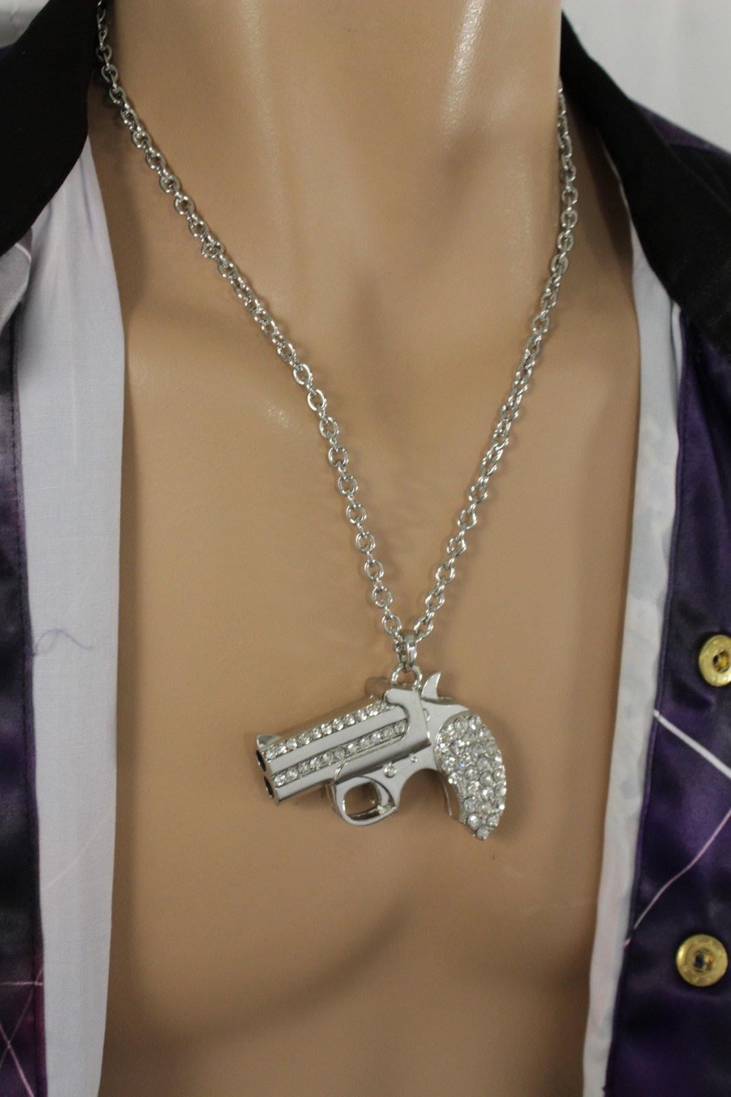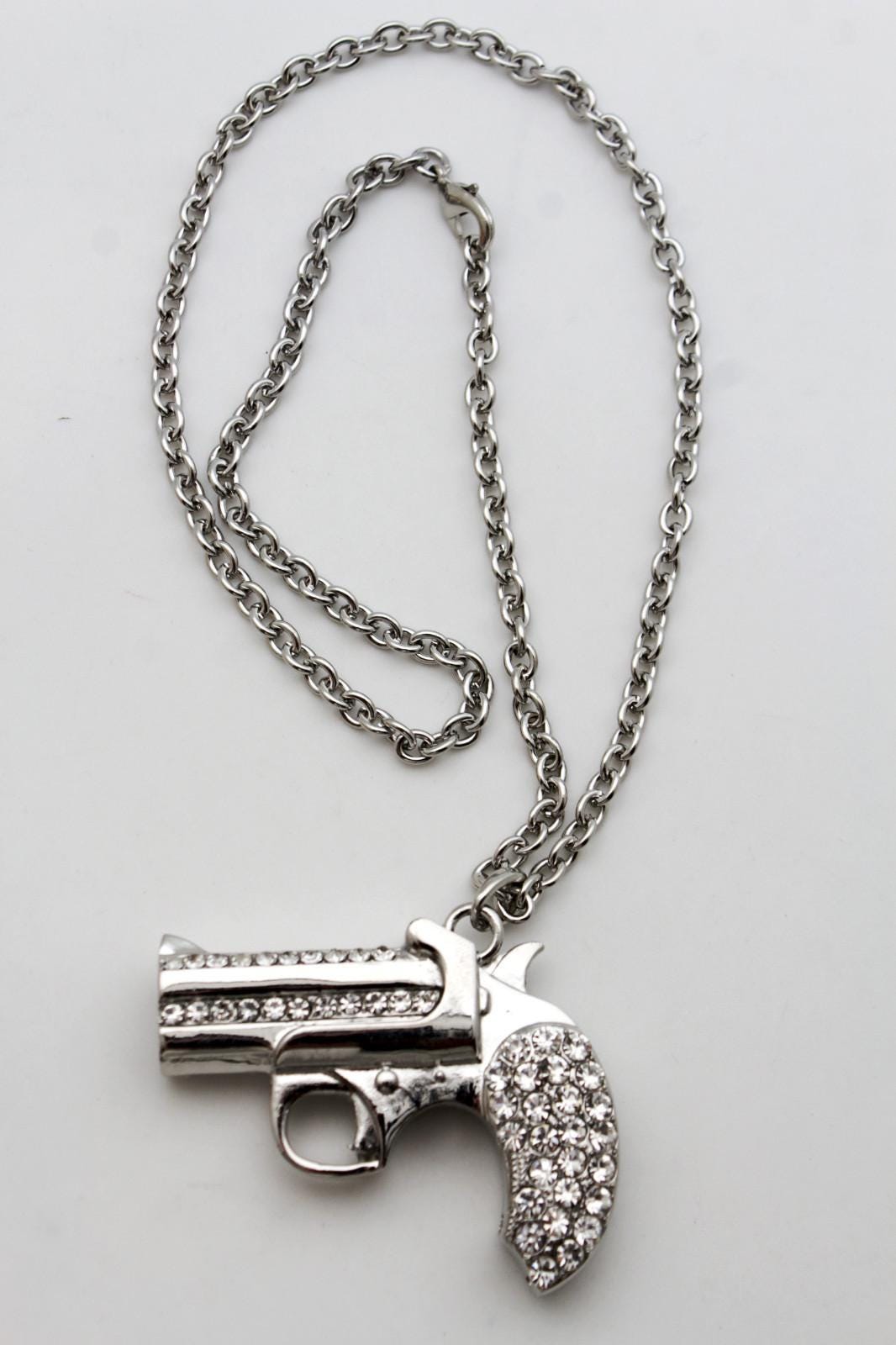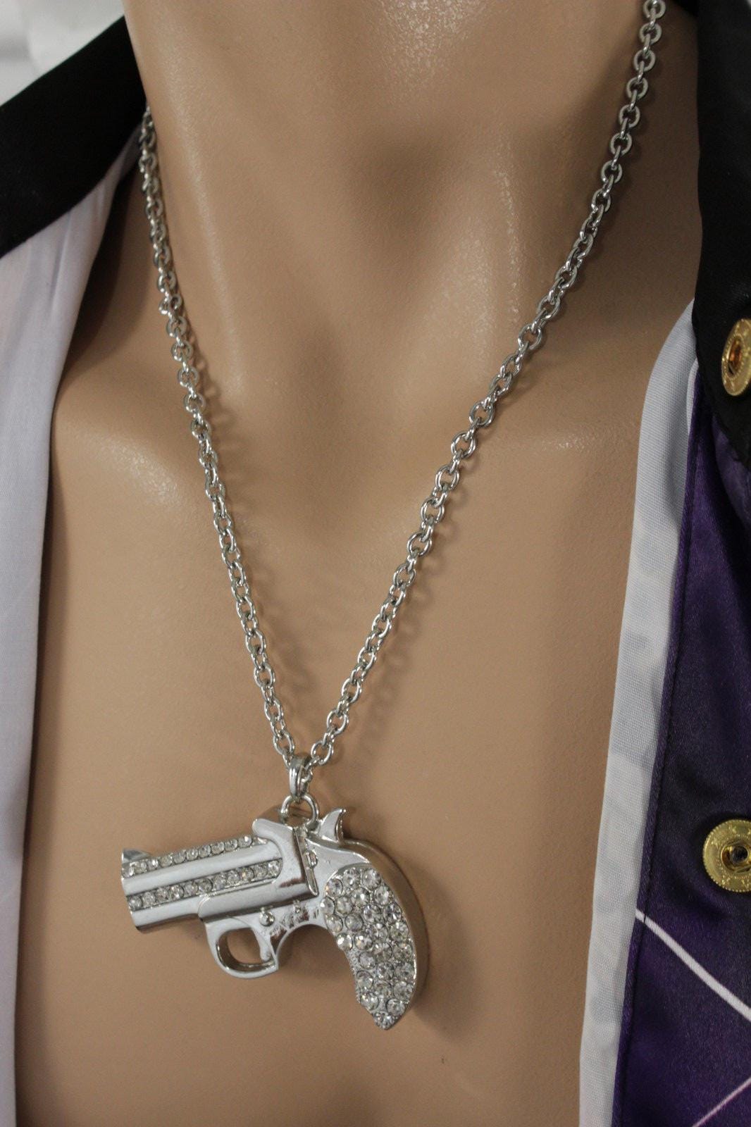 This silver-tone statement necklace is made for outfits that want a little more attitude and a lot more personality. The bold revolver-inspired pendant is finished with clear rhinestones for extra shine, giving the piece a flashy, fashion-forward look that stands out in photos, at concerts, on stage, or with everyday streetwear styling.