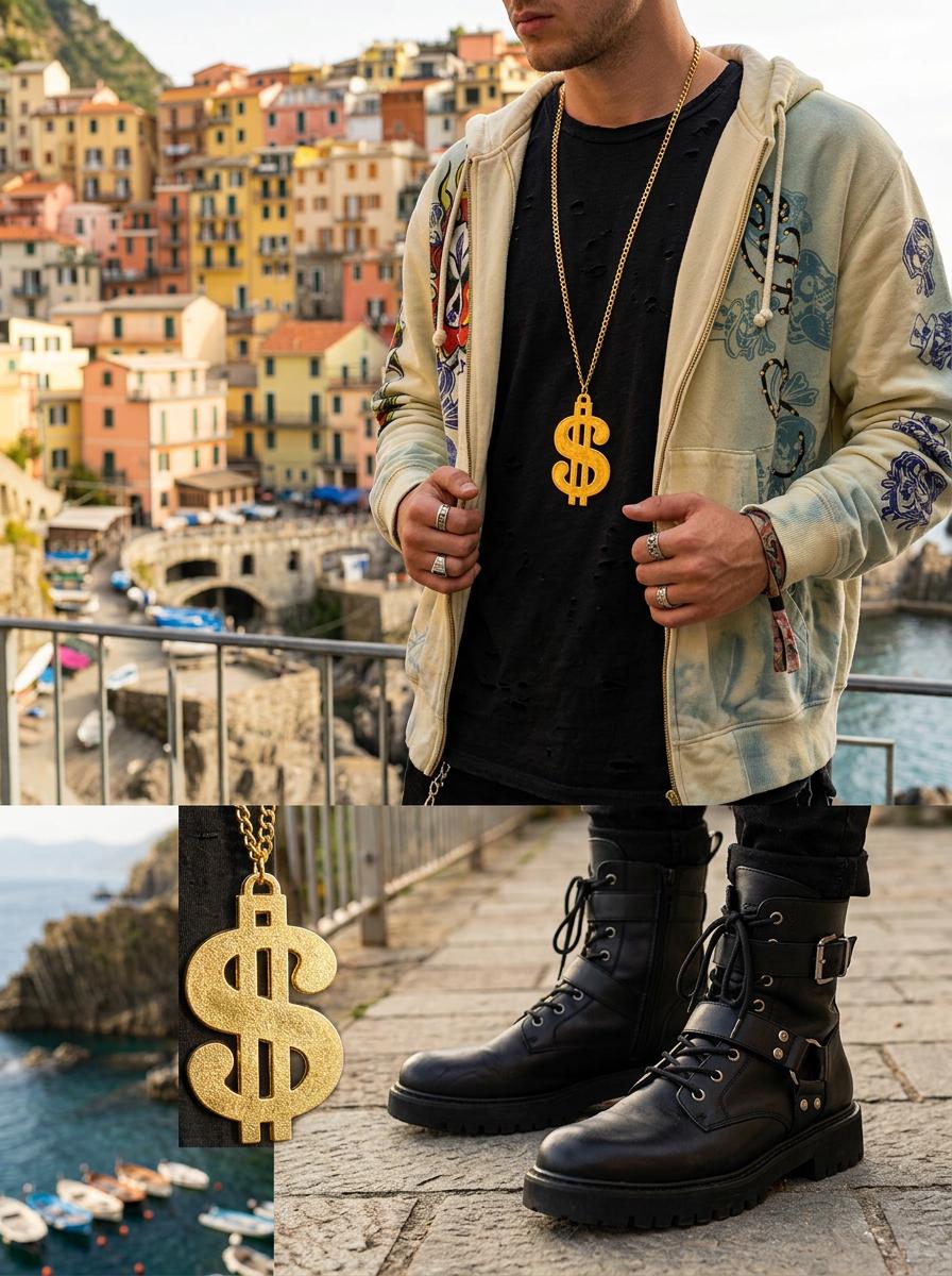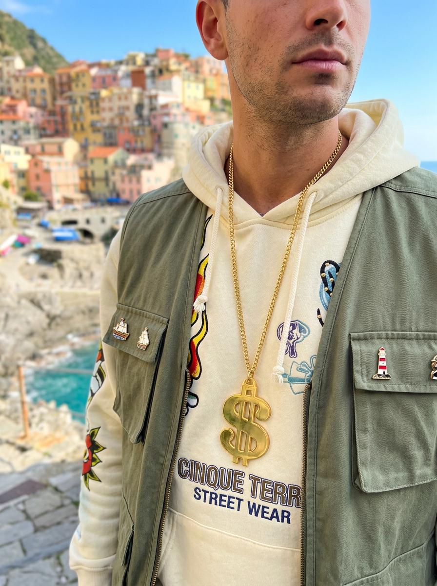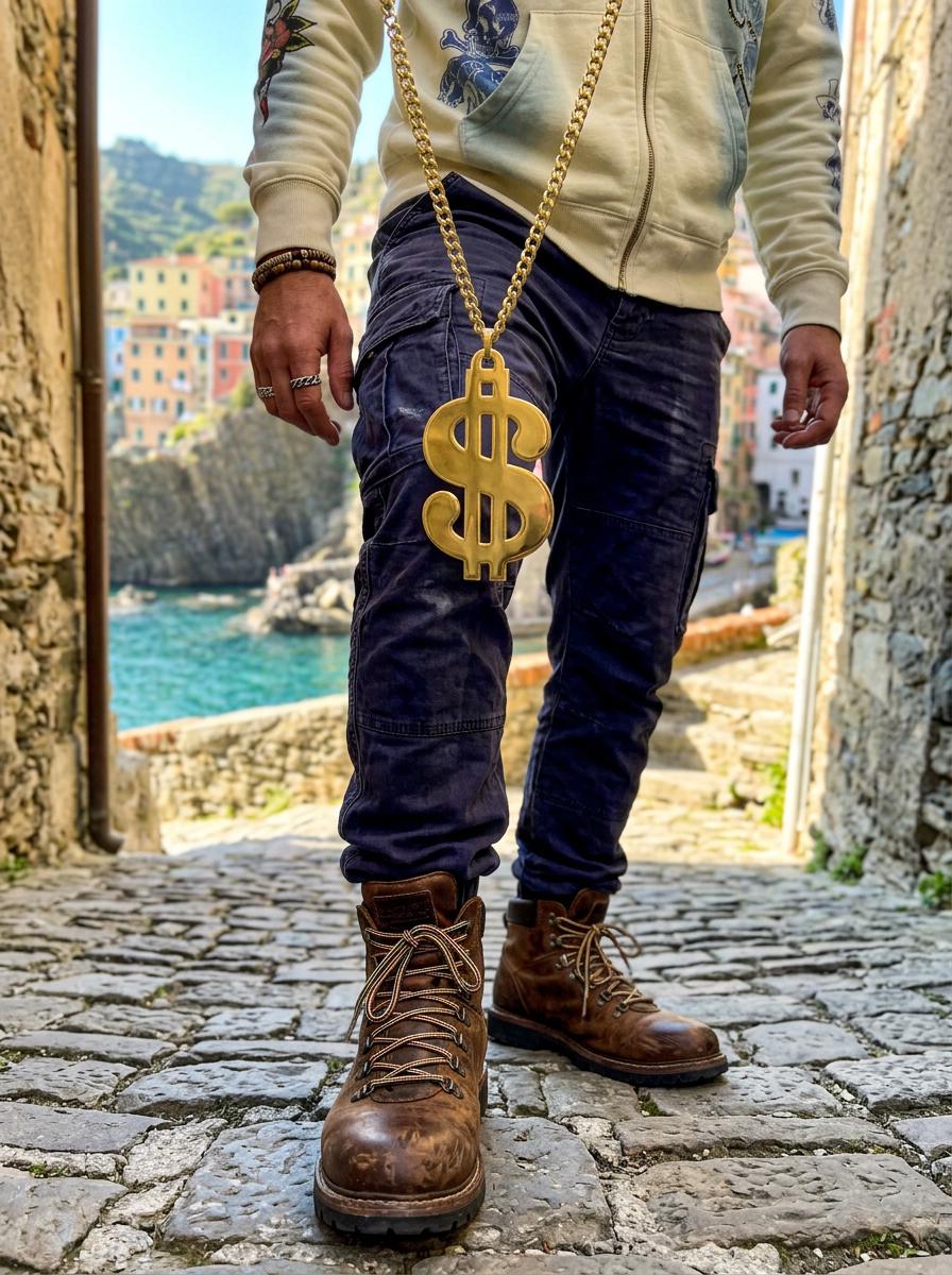 The oversized dollar sign pendant gives this necklace a strong graphic look that reads clearly in person and in photos. The long chain lets it hang low on the chest, which makes it especially good with tees, hoodies, open jackets, vests, denim, and travel-ready streetwear looks. The gold tone finish adds bright shine and helps the pendant stand out beautifully against darker basics and layered casual outfits.