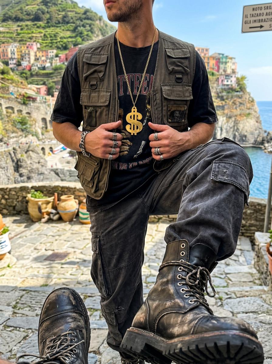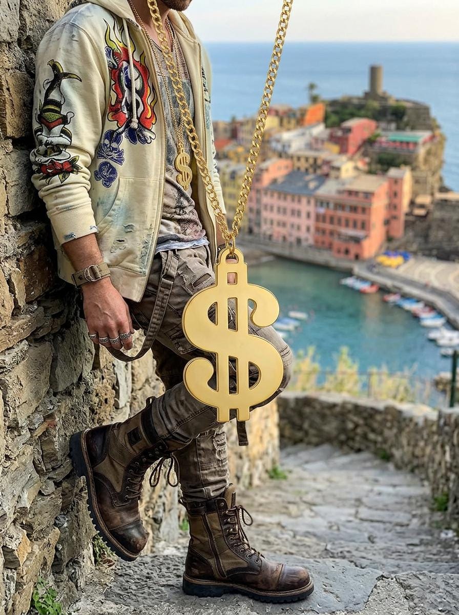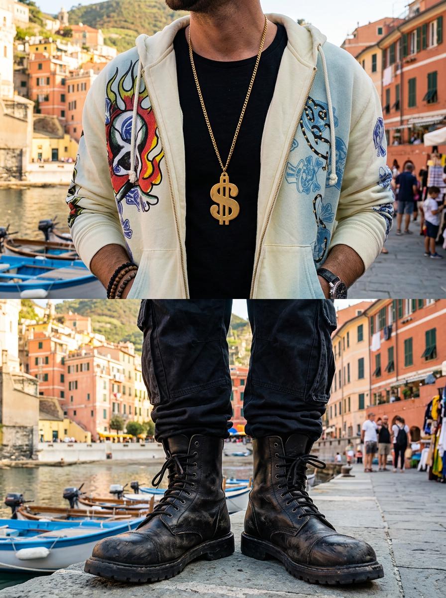 The oversized dollar sign pendant gives this necklace a strong graphic look that reads clearly in person and in photos. The long chain lets it hang low on the chest, which makes it especially good with tees, hoodies, open jackets, vests, denim, and travel-ready streetwear looks. The gold tone finish adds bright shine and helps the pendant stand out beautifully against darker basics and layered casual outfits.
