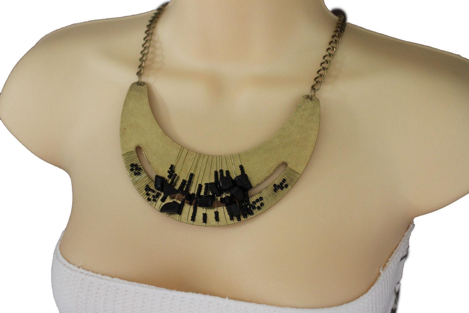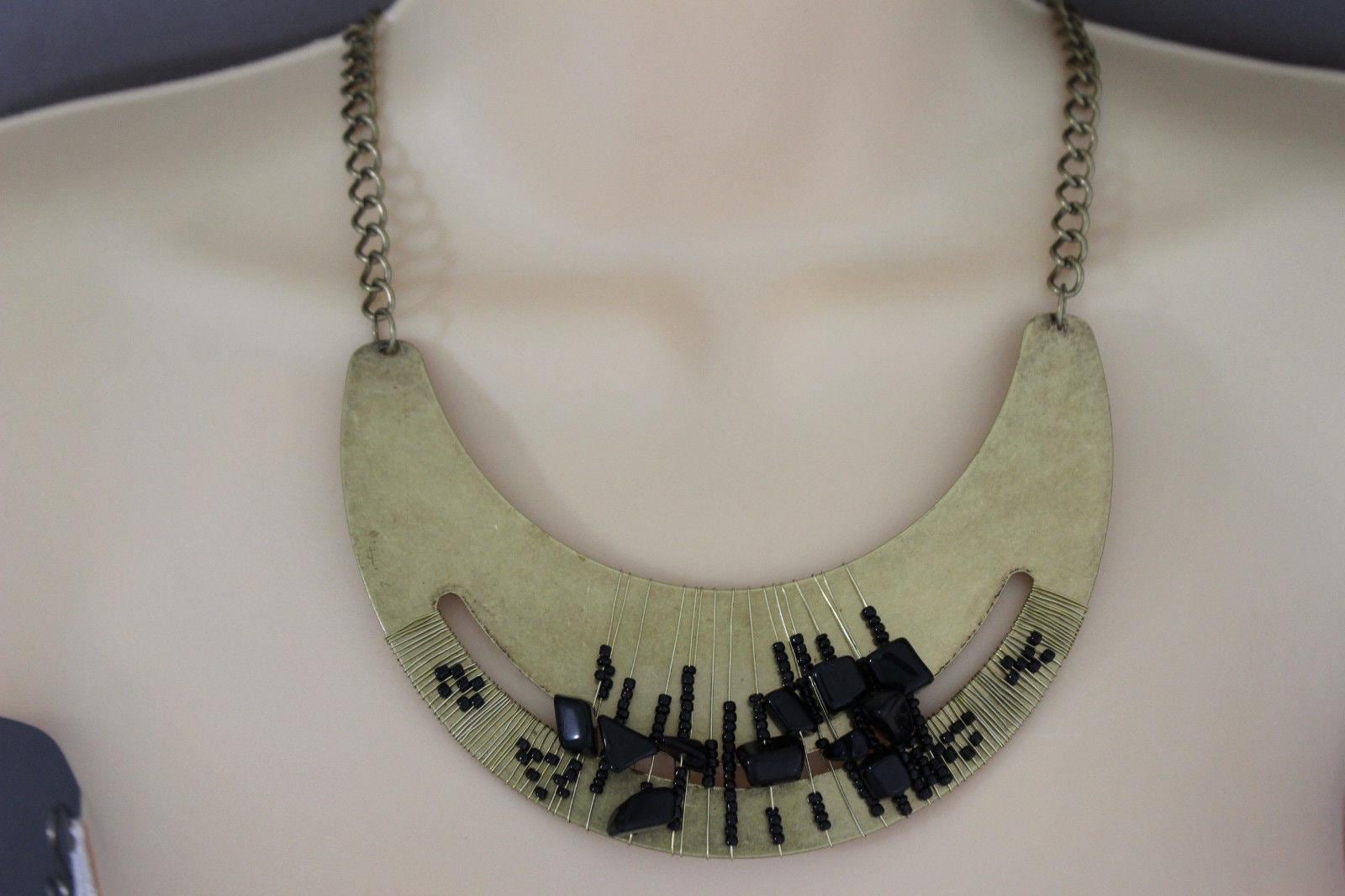 gold crescent bib necklace black bead statement jewelry set matching earrings