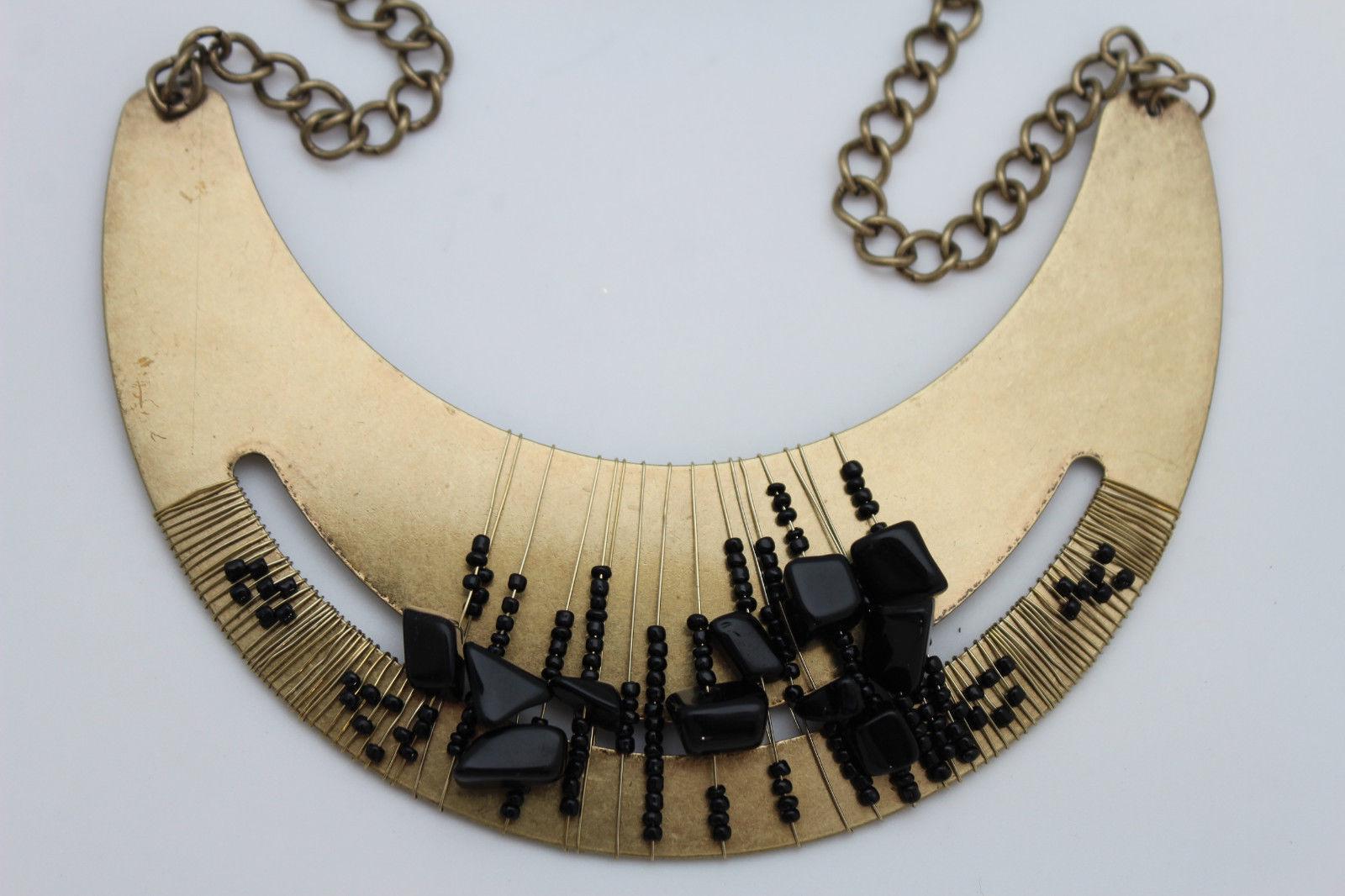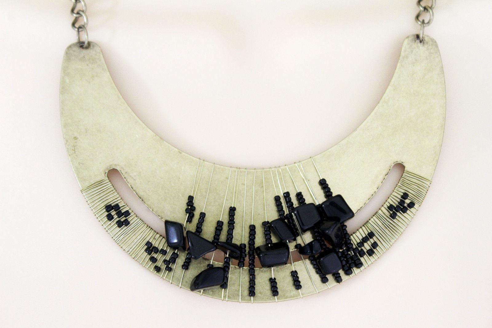 This gold-tone crescent bib necklace and matching earrings set features a wide curved metal plate, black bead accents, black stone-look pieces, and wire-wrapped fringe-style details. The design has a modern artistic look that feels bold, unique, and easy to style with both casual and dressy outfits.